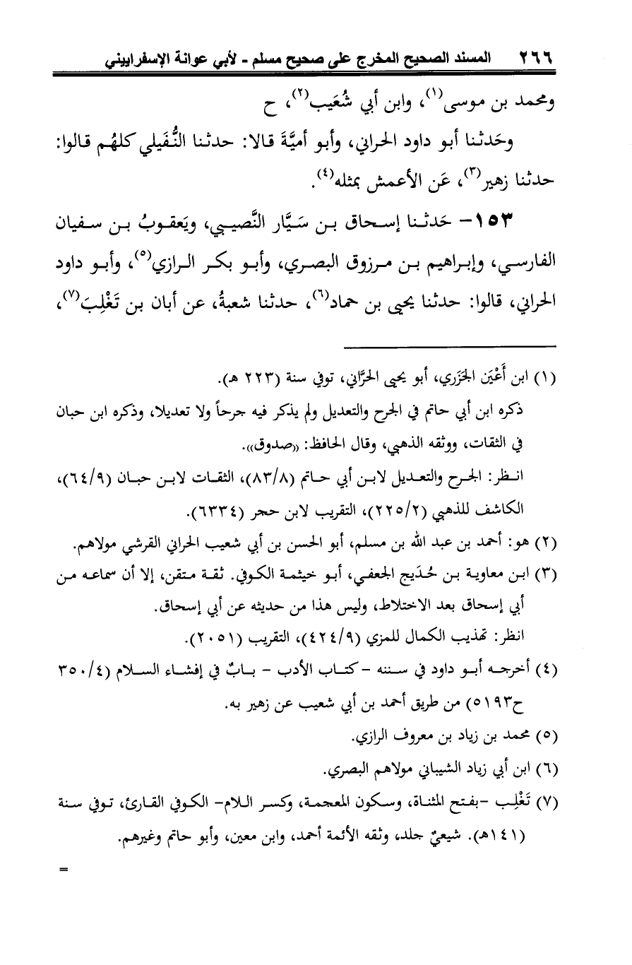 153 - حَدثنا إسحاق بن سَيَّار النَّصيبي، ويَعقوبُ بن سفيان الفارسي، وإبراهيم بن مرزوق البصري، وأبو بكر الرازي (¬1)، وأبو داود الحراني، قالوا: حدثنا يحيى بن حماد (¬2)، حدثنا شعبةُ، عن أبان بن تَغْلِبَ (¬3)،