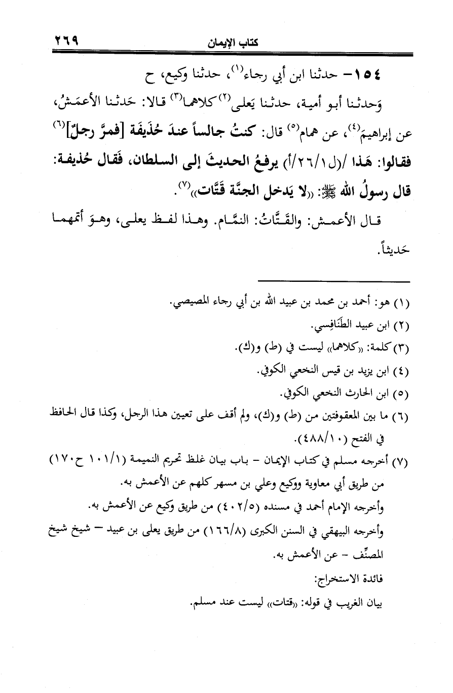 وَحدثنا أبو أمية، حدثنا يَعلى (¬2) كلاهما (¬3) قالا: حَدثنا الأعمَشُ، عن إبراهيمَ (¬4)، عن همام (¬5) قال: كنتُ جالسًا عندَ حُذَيفَة [فمرَّ رجلٌ] (¬6) فقالوا: هَذا يرفعُ الحديثَ إلى السلطان، فَقال حُذيفة: قال رسولُ الله -صلى الله عليه وسلم-: "لا يَدخل الجنَّة قَتَّات" (¬7).