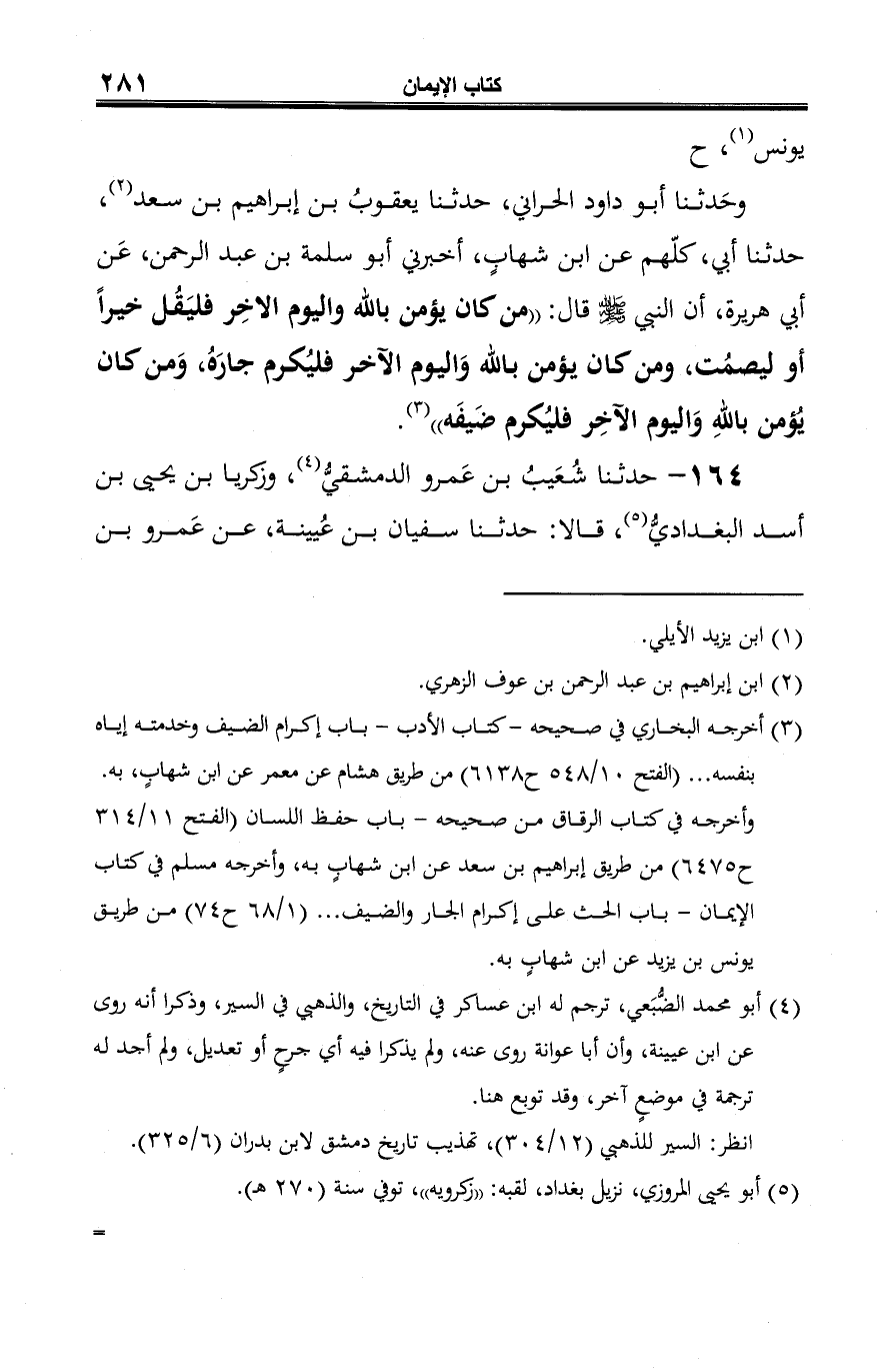 -[282]- دينار (¬3)، سمع نافعَ بن جُبير (¬4)، يخبر عن أبي شُرَيحٍ الخزاعي (¬5) أَن النبي -صلى الله عليه وسلم- قال: "من كان يؤمن بالله واليوم الآخِر فليُحْسِن إلى جارِهِ، و (¬6) مَن كان يؤمن باللهِ واليوم الآخر فليُكْرِم ضَيفَه، ومن كان يؤمن بالله واليوم الآخِر فليقل خيرًا أو ليسْكُت" (¬7).