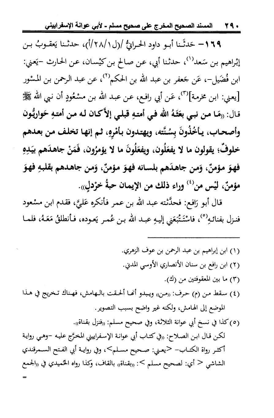 169 - حَدثَنا أبو داود الحرانيُّ، حدثنا يَعقوبُ بن إبْراهيم بن سَعد (¬1)، حدثنا أبي، عن صالح بن كيْسان، عن الحارث -يَعني: ابن فُضَيل-، عَن جَعفر بن عبد الله بن الحكم (¬2)، عن عبد الرحمن بن المسْور [يعني: ابن مخرمة] (¬3)، عَن أبي رافع، عن عبد الله بن مسْعُودٍ أن نبي الله -صلى الله عليه وسلم- قال: "مَا من نبي بعَثَهُ الله في أمتهِ قبلي إلَّا كان له من أمتهِ حَواريُّون وأصحاب، يأخُذُونَ بِسُنَّته، ويهتدون بأمْرِهِ، ثم إنها تخلف من بعدهم خلوفٌ؛ يقولون ما لا يفعَلُون، ويفعَلُونَ ما لا يؤمرُون، فَمَنْ جاهدَهم بيَدِهِ فهوَ مؤمنٌ، وَمن جاهدَهم بلسانه فهوَ مؤمنٌ، وَمن جاهدهم بقلبهِ فهوَ مؤمنٌ، ليْس من (¬4) وراء ذلك من الإيمان حبةُ خرْدلٍ".