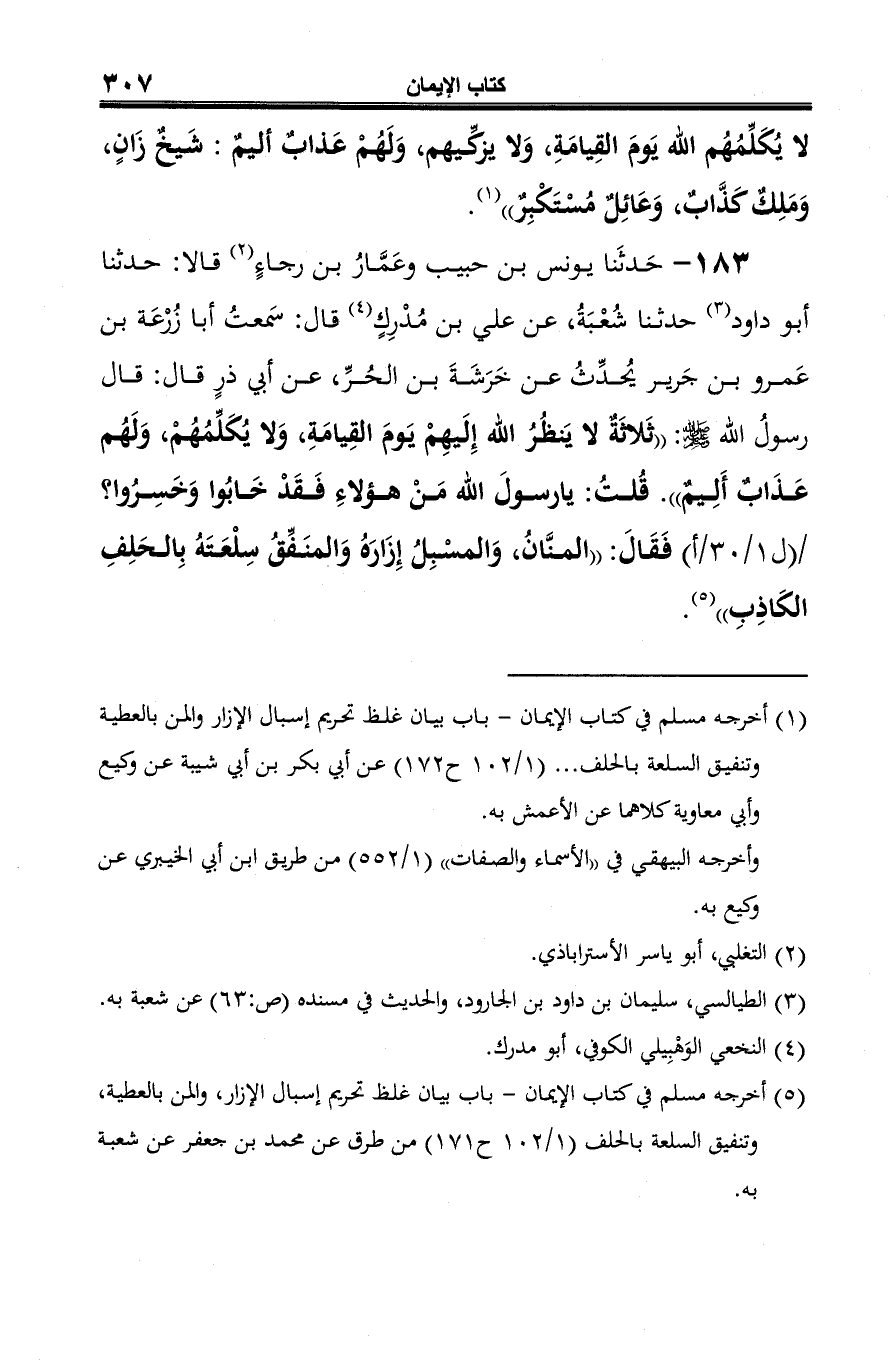 183 - حَدثَنا يونس بن حبيب وعَمَّارُ بن رجاءٍ (¬1) قالا: حدثنا أبو داود (¬2) حدثنا شُعْبَةُ، عن علي بن مُدْرِكٍ (¬3) قال: سمعتُ أبا زُرْعَة بن عَمرو بن جَرير يُحدِّثُ عن خَرَشَةَ بن الحُرِّ، عن أبي ذرٍ قال: قال رسولُ الله -صلى الله عليه وسلم-: "ثَلاثَةٌ لا يَنظُرُ الله إِلَيهِمْ يَومَ القِيامَةِ، وَلا يُكَلّمُهُمْ، وَلَهُم عَذَابٌ أَلِيمٌ". قُلتُ: يا رسولَ الله مَنْ هؤلاءِ فَقَدْ خَابُوا وَخَسِرُوا؟ فَقَالَ: "المنَّانُ، وَالمسْبِلُ إِزَارَهُ وَالمنَفِّقُ سِلْعَتَهُ بِالحَلِفِ الكاذِبِ" (¬4).