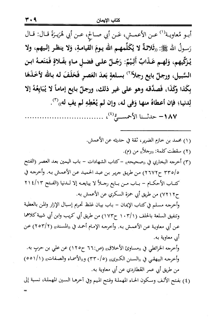 -[310]- وابن أبي رجَاءٍ (¬2)، وَابن أبي الخيبَرِيّ (¬3)، قالوا (¬4): حدثنا وكيع بن الجرَّاح، حدثنا الأعمش، عن أبي صالحٍ، عن أبي هُرَيرةَ قال: قال رسول الله -صلى الله عليه وسلم-: "ثلاثةٌ لا يُكَلِّمُهم الله يومَ القيامةِ، وَلا يُزَكِّيهِم، ولهم عَذَابٌ أَلِيْمٌ: رَجُلٌ منعَ ابن السبيل فَضْلَ مَاءٍ عِنده، وَرَجُلٌ حَلَفَ على سِلْعَةٍ بعدَ العَصْرِ كاذبًا فصَدَّقه واشتراها بقولهِ، ورجلٌ بَايعَ إمامًا فَإن أُعْطِيَ وَفى (¬5)، وَإن لم يُعْطِهِ لم يفِ له" (¬6).