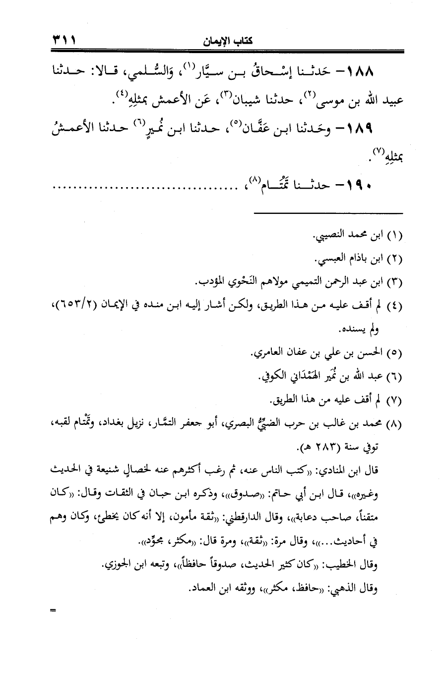 188 - حَدثنا إسْحاقُ بن سيَّار (¬1)، وَالسُّلمي، قالا: حدثنا عبيد الله بن موسى (¬2)، حدثنا شيبان (¬3)، عَن الأعمش بمثلِهِ (¬4).