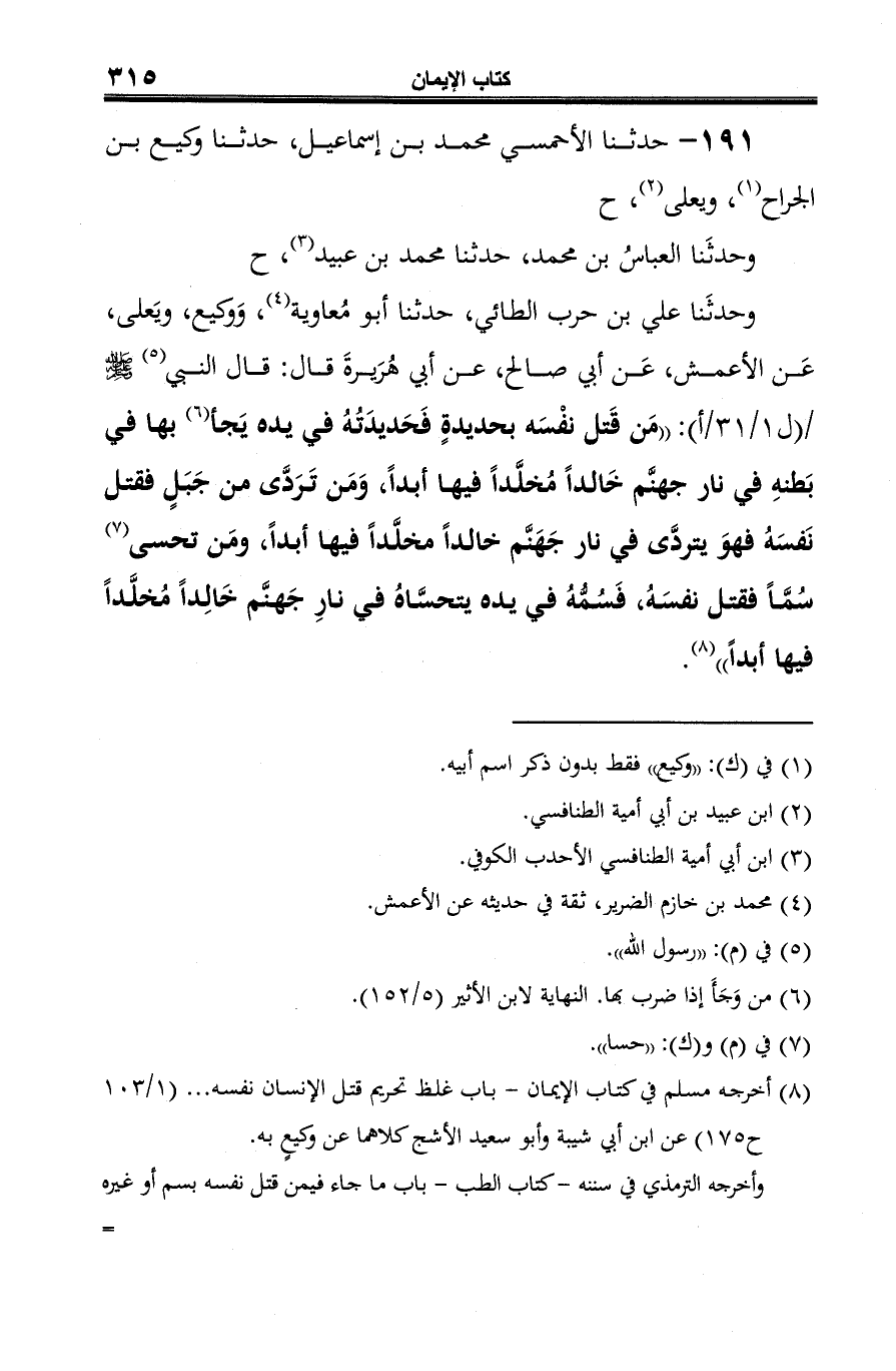 (¬8) أخرجه مسلم في كتاب الإيمان -باب غلظ تحريم قتل الإنسان نفسه ... (1/ 103 ح 175) عن ابن أبي شيبة وأبو سعيد الأشج كلاهما عن وكيعٍ به.