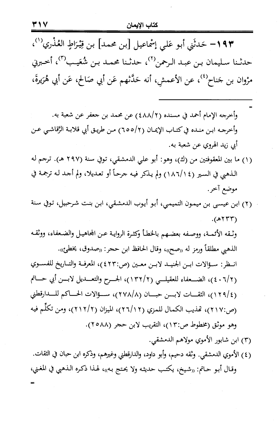193 - حَدثَني أبو عَلي إسْماعيل [بن محمد] بن قِيْرَاطٍ العُذْري (¬1)، حدثنا سليمان بن عبد الرحمن (¬2)، حدثنا محمد بن شُعَيب (¬3)، أخبرني مرْوان بن جَناح (¬4)، عن الأعمشِ، أنه حَدَّثهم عَن أبي صَالح، عَن أبي هُرَيرةَ،
