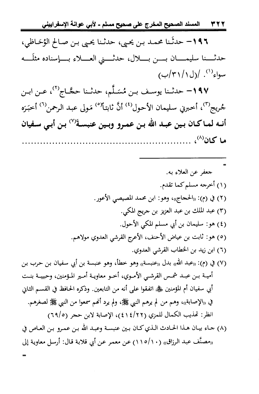 197 - حدثنا يوسف بن مُسَلَّم، حدثنا حجَّاج (¬1)، عن ابن جُريج (¬2)، أخبرني سليمان الأحول (¬3) أنَّ ثابتًا (¬4) مَولى عبد الرحمن (¬5) أخبَرَه أنه لما كان بين عبد الله بن عمرو وبين عنبسةَ (¬6) بن أبي سفيان ما كان (¬7)،