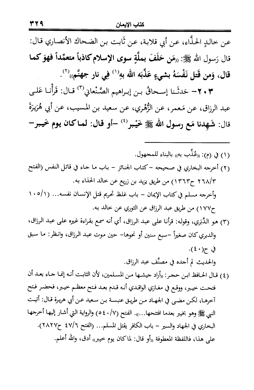 203 - حَدثَنا إسحاقُ بن إبراهيم الصَّنْعاني (¬1) قال: قَرأْنا عَلى عبد الرزاق، عن مَعمر، عن الزُّهْري، عن سعيد بن المسيب، عن أبي هُرَيرَةَ قال: شَهِدنا مَع رسول الله -صلى الله عليه وسلم- خَيْبر (¬2) -أو قال: لما كان يوم خَيبر-