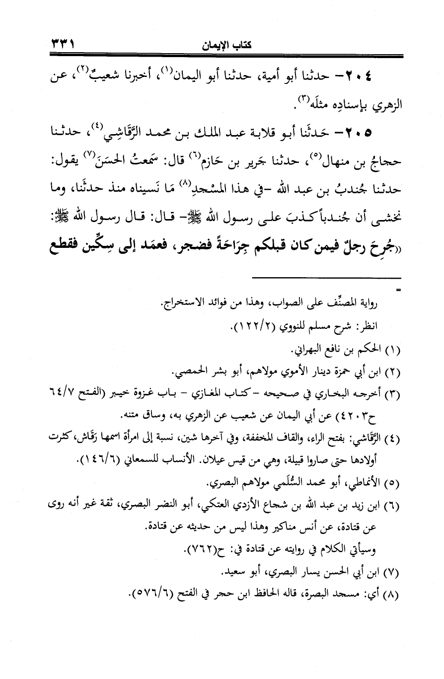 205 - حَدثَنا أبو قلابة عبد الملك بن محمد الرَّقَاشِي (¬1)، حدثنا حجاجُ بن منهال (¬2)، حدثنا جَرير بن حَازم (¬3) قال: سمعتُ الحسَنَ (¬4) يقول: حدثنا جُندبُ بن عبد الله -في هذا المسْجدِ (¬5) مَا نَسيناه منذ حدثَنا، وما نخشى أن جُندبًا كذبَ على رسول الله -صلى الله عليه وسلم- قال: قال رسول الله -صلى الله عليه وسلم-: "جُرِحَ رجلٌ فيمن كان قبلكم جِرَاحَةً فضجر، فعمَد إلى سِكِّين فقطع