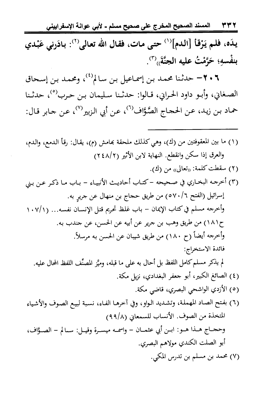 206 - حدثنا محمد بن إسماعيل بن سالم (¬1)، ومحمد بن إسحاق الصغاني، وأبو داود الحراني، قالوا: حدثنا سليمان بن حرب (¬2)، حدثنا حماد بن زيد، عن الحجاج الصَّوَّاف (¬3)، عن أبي الزبير (¬4)، عن جابر قال: