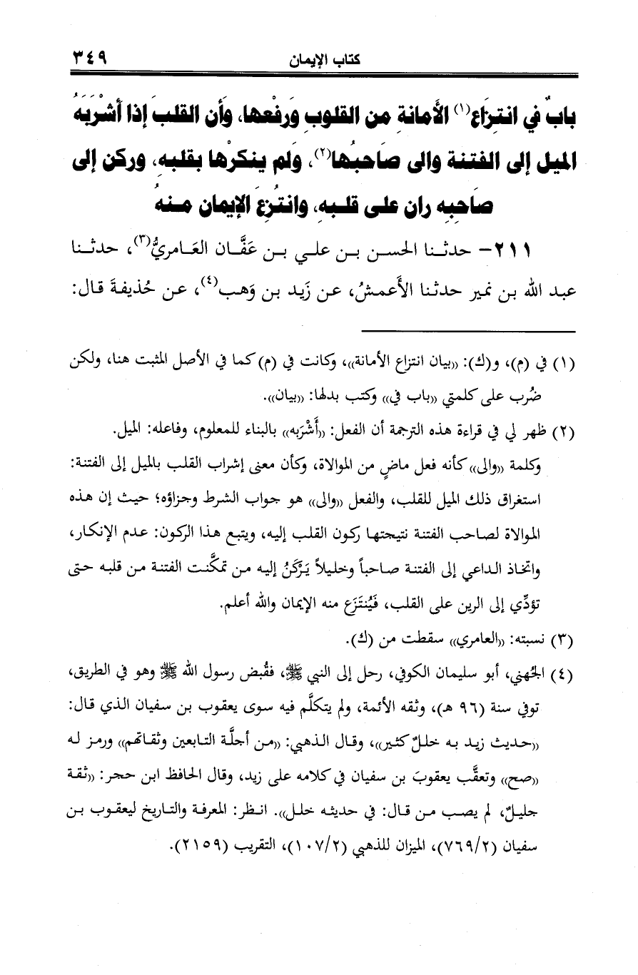211 - حدثنا الحسن بن علي بن عَفَّان العَامريُّ (¬1)، حدثنا عبد الله بن نمير حدثنا الأَعمشُ، عن زَيد بن وَهب (¬2)، عن حُذيفةَ قال: