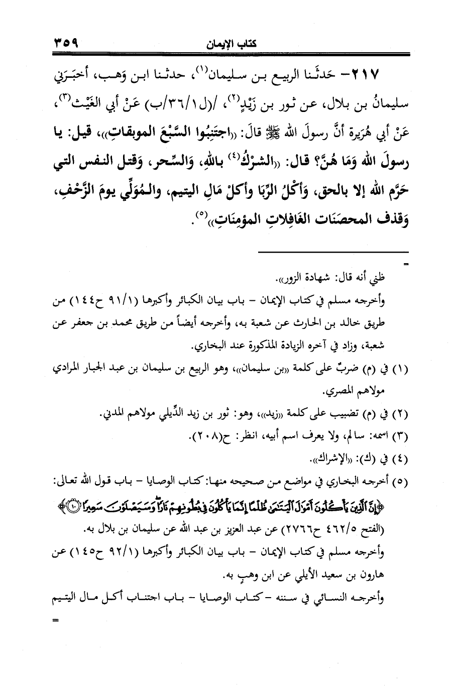 217 - حَدثَنا الربيع بن سليمان (¬1)، حدثنا ابن وَهب، أخبَرَني سليمانُ بن بلال، عن ثور بن زَيْدٍ (¬2)، عَنْ أبي الغَيْث (¬3)، عَنْ أبي هُرَيرة أنَّ رسولَ الله -صلى الله عليه وسلم- قالَ: "اجتَنِبُوا السَّبْعَ الموبقاتِ"، قيل: يا رسولَ الله وَمَا هُنَّ؟ قال: "الشرْكُ (¬4) باللهِ، وَالسِّحر، وَقتل النفس التي حَرَّم الله إلا بالحق، وَأكْلُ الرِّبَا وأكلْ مَالِ اليتيم، والمُوَلِّي يومَ الزَّحْفِ، وَقذف المحصَنَات الغَافِلاتِ المؤمِنَاتِ" (¬5).