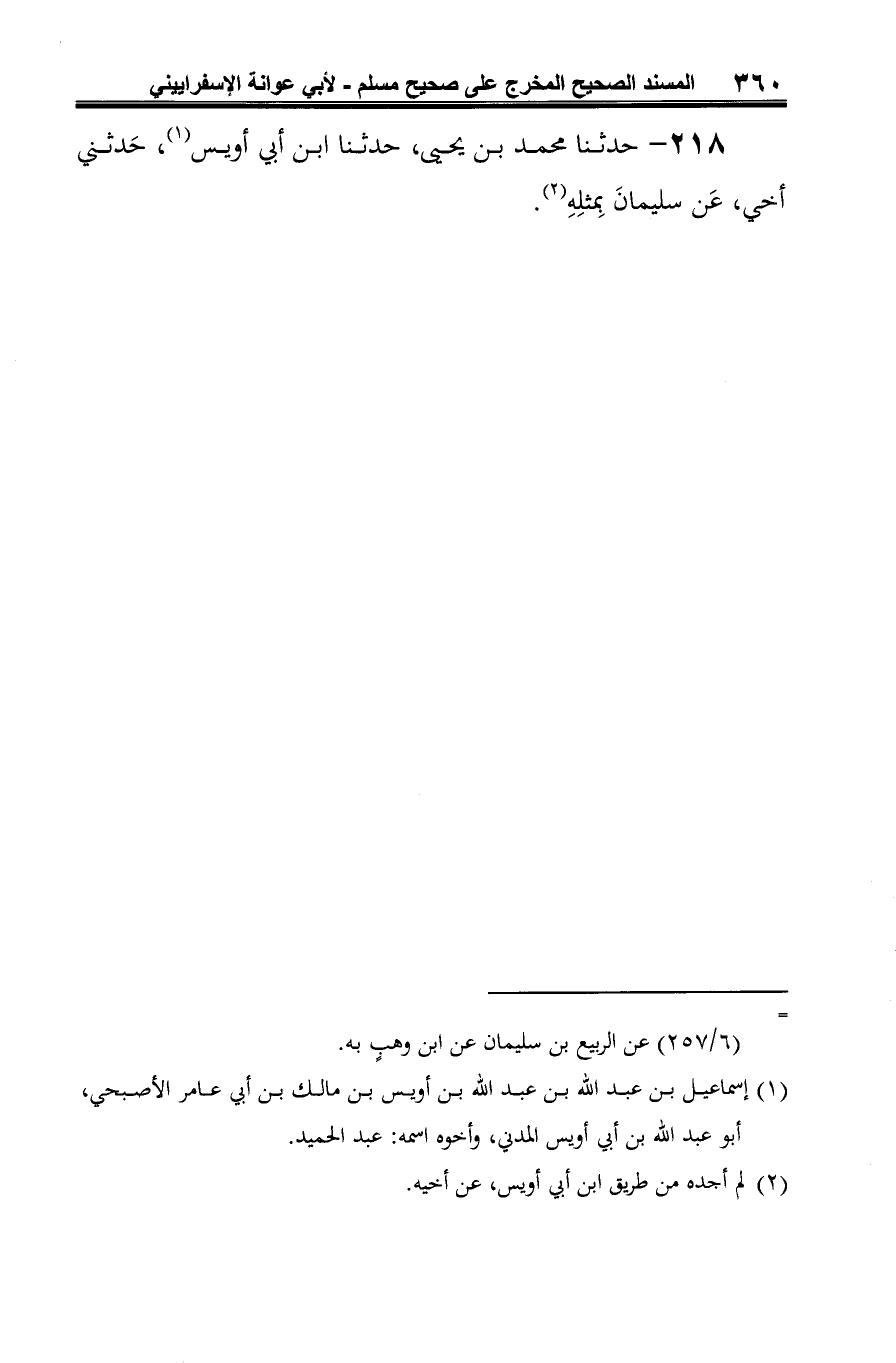 218 - حدثنا محمد بن يحيى، حدثنا ابن أبي أويس (¬1)، حَدثني أخي، عَن سليمانَ بِمثلِهِ (¬2).