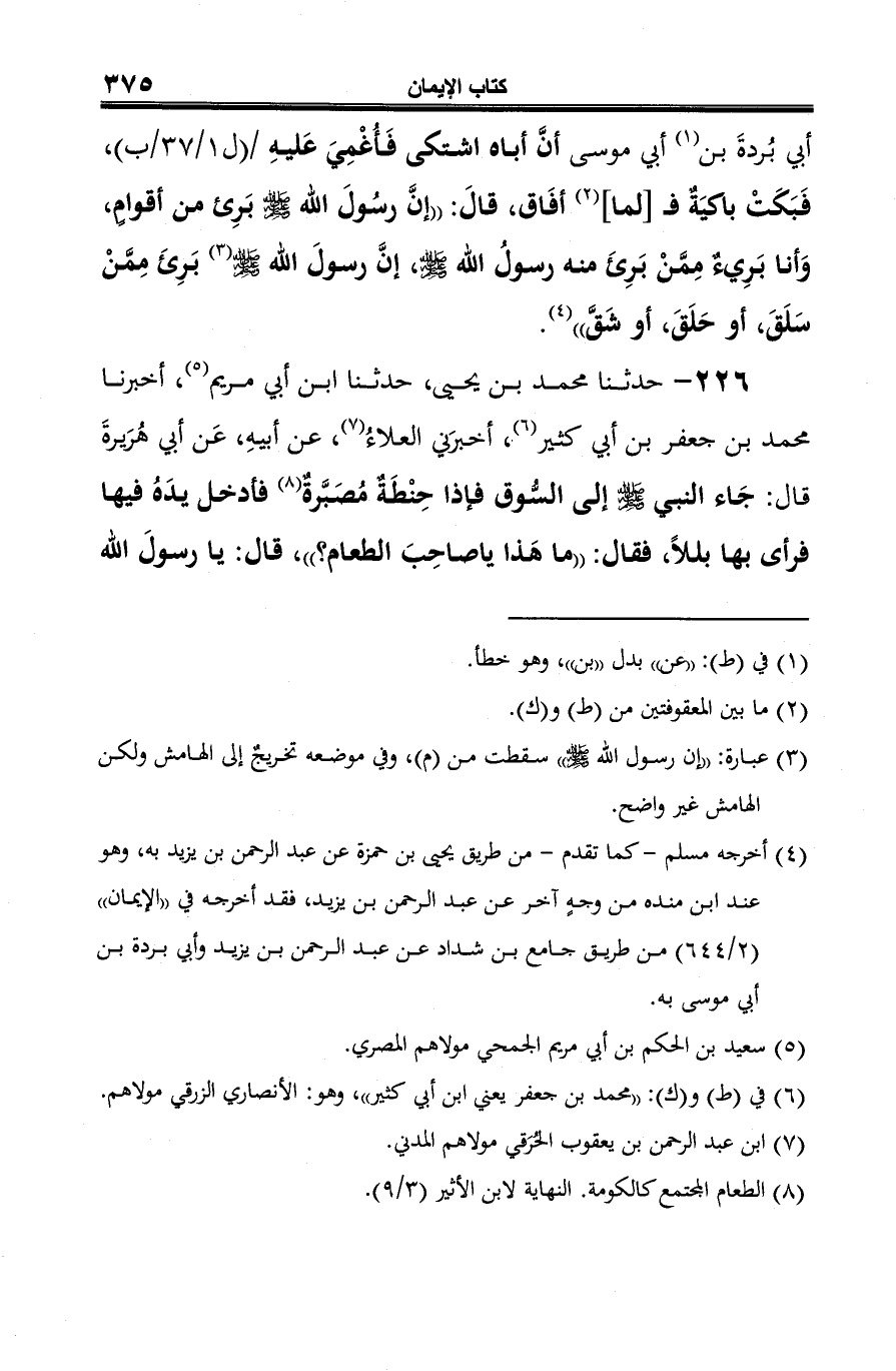 226 - حدثنا محمد بن يحيى، حدثنا ابن أبي مريم (¬1)، أخبرنا محمد بن جعفر بن أبي كثير (¬2)، أخبرَني العلاءُ (¬3)، عن أبيهِ، عَن أبي هُرَيرةَ قال: جَاء النبي -صلى الله عليه وسلم- إلى السُّوق فإذا حِنْطَةٌ مُصَبَّرةٌ (¬4) فأدخل يدَهُ فيها فرأى بها بللًا، فقال: "ما هَذا يا صاحِبَ الطعام؟ "، قال: يا رسولَ الله