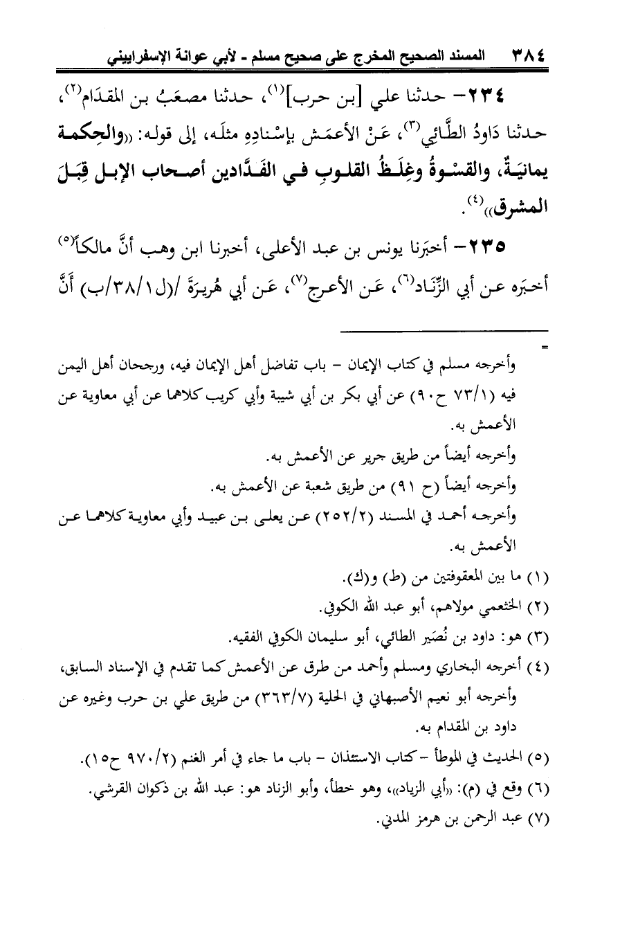 234 - حدثنا علي [بن حرب] (¬1)، حدثنا مصعَبُ بن المقدَام (¬2)، حدثنا دَاودُ الطَّائِي (¬3)، عَنْ الأعمَش بإسْنادِهِ مثلَه، إلى قوله: "والحِكمة يمانيَةٌ، والقسْوةُ وغِلَظُ القلوبِ في الفَدَّادين أصحاب الإبل قِبَلَ المشرق" (¬4).