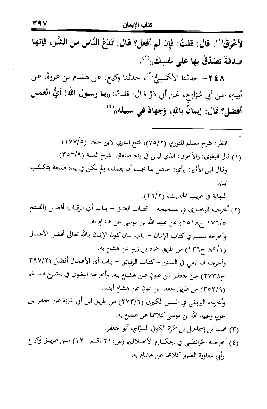 248 - حدثنا الأحمسي (¬1)، حدثنا وكيع، عن هشام بن عروةَ، عن أبيه، عن أبي مُرَاوحٍ، عن أبي ذرٍّ قال: قلتُ: "يا رسول الله! أيُّ العمل أفضل؟ قال: إيمانٌ بالله، وجهادٌ في سبيله" (¬2).