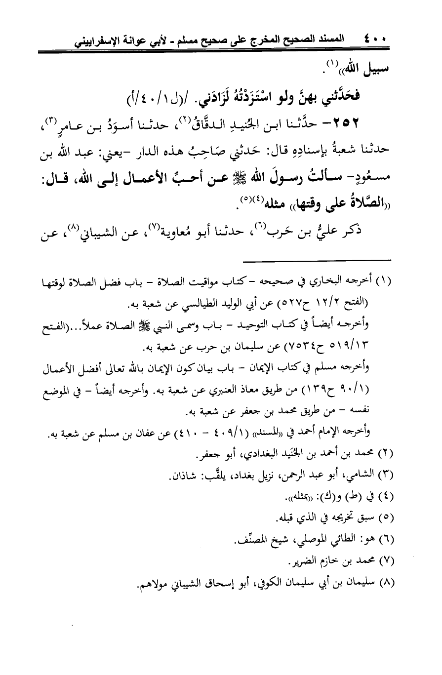 252 - حدَّثنا ابن الجُنيدِ الدقَّاقُ (¬1)، حدثنا أسوَدُ بن عامرٍ (¬2)، حدثنا شعبةُ بإسنادِهِ قال: حَدثني صَاحِبُ هذه الدار -يعني: عبد الله بن مسعُودٍ- سألتُ رسولَ الله -صلى الله عليه وسلم- عن أحبِّ الأعمال إلى الله، قال: "الصَّلاةُ على وقتها" مثله (¬3) (¬4).