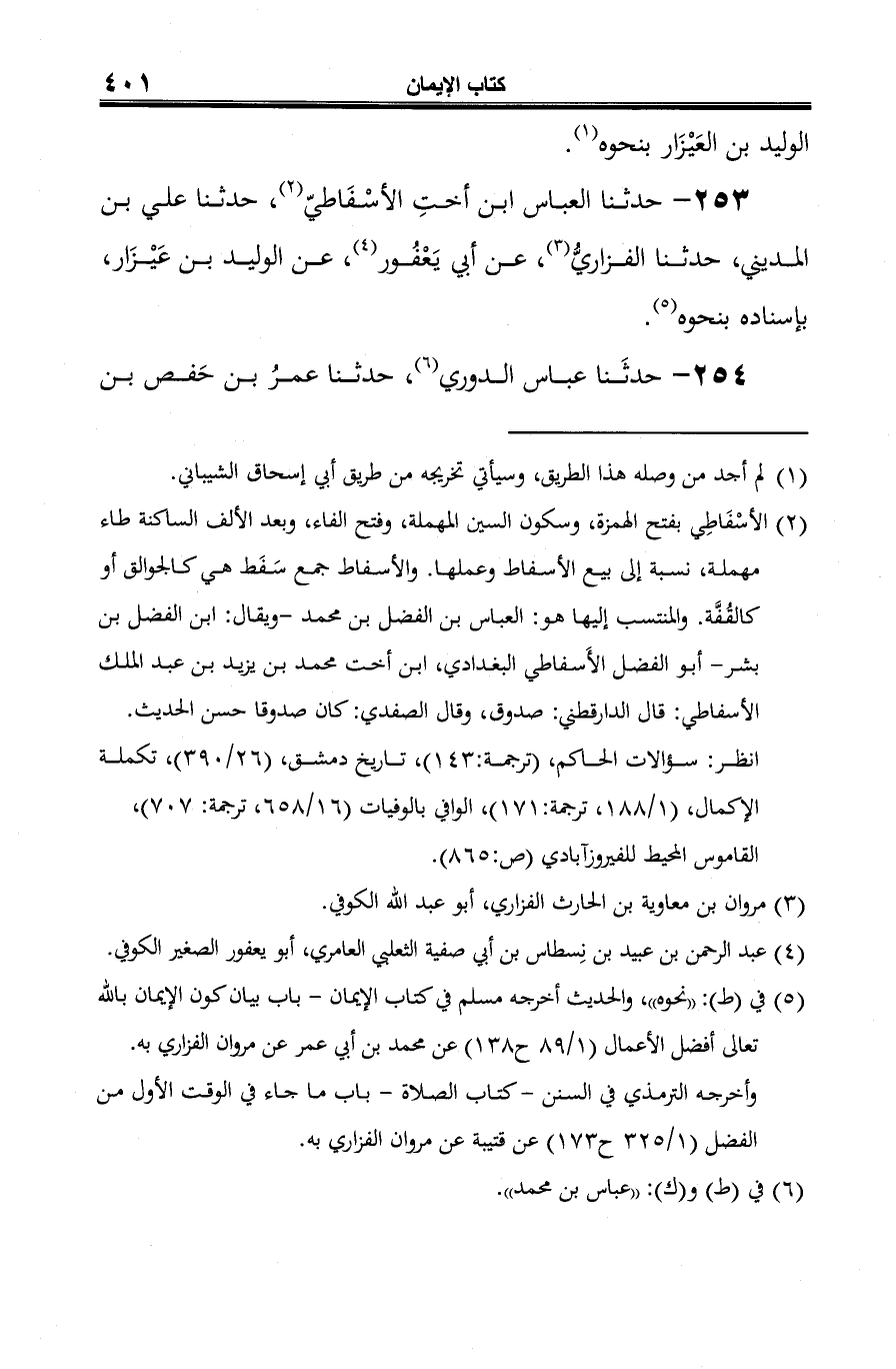 253 - حدثنا العباس ابن أختِ الأسْفَاطيّ (¬1)، حدثنا علي بن المديني، حدثنا الفزاريُّ (¬2)، عن أبي يَعْفُور (¬3)، عن الوليد بن عَيْزَار، بإسناده بنحوه (¬4).