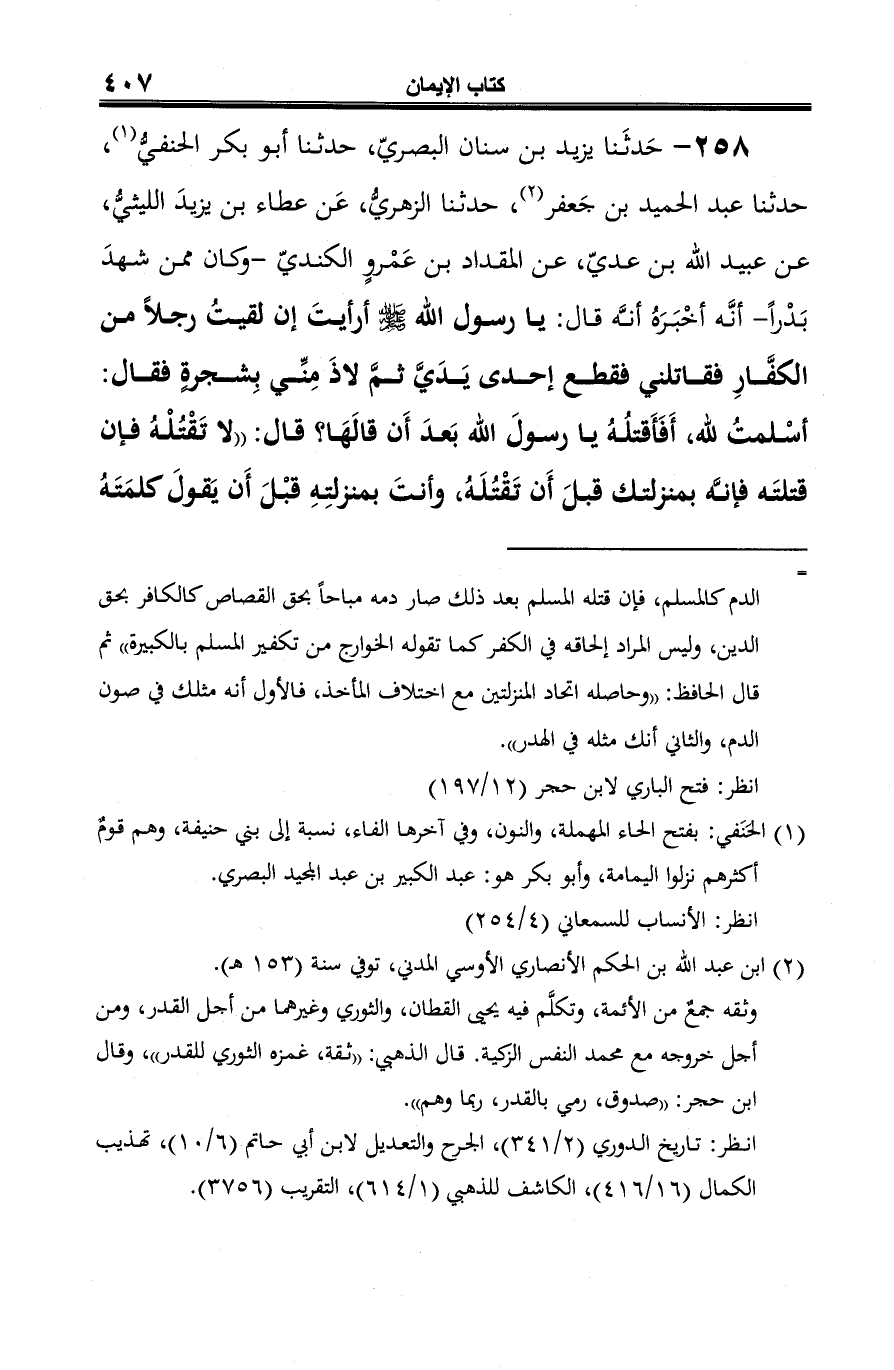 258 - حَدثَنا يزيد بن سنان البصريّ، حدثنا أبو بكر الحنفيُّ (¬1)، حدثنا عبد الحميد بن جَعفر (¬2)، حدثنا الزهريُّ، عَن عطاء بن يزيدَ الليثيُّ، عن عبيد الله بن عديّ، عن المقداد بن عَمْروٍ الكنديّ -وكان ممن شهدَ بَدْرًا- أنَّه أخْبَرَهُ أنَّه قال: يا رسول الله -صلى الله عليه وسلم- أرأيتَ إن لقيتُ رجلًا من الكفَّارِ فقاتلني فقطع إحدى يَدَيَّ ثمَّ لاذَ مِنِّي بِشجرةٍ فقال: أسْلمتُ لله، أَفَأَقتلُهُ يا رسولَ الله بَعدَ أَن قالَهَا؟ قال: "لا تَقْتُلْهُ فإن قتلتَه فإنَّه بمنزلتك قبلَ أَن تَقْتُلَهُ، وأنتَ بمنزلتِهِ قبْلَ أَن يَقولَ كلمَتَهُ