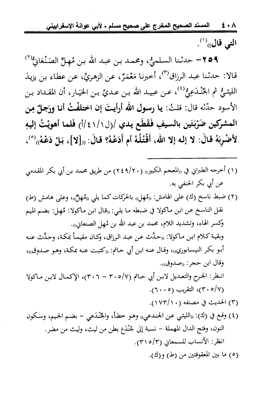 259 - حدثنا السلميُّ، ومحمد بن عبد الله بن مُهِلٍّ الصَنْعَانيُّ (¬1) قالا: حدثنا عبد الرزاق (¬2)، أخبرنا مَعْمَرٌ، عن الزهريِّ، عن عطاء بن يزيدَ الليثيُّ ثم الجُنْدَعِيُّ (¬3)، عن عبيد الله بن عديّ بن الخيَار، أن المقداد بن الأسود حدّثه قال: قلتُ: يا رسول الله أرأيتَ إن اختلفْتُ أنا ورَجلٌ مِن المشركين ضَرْبَتَين بالسيفِ فَقَطَع يدي فَلما أهويْتُ إليهِ لأضْرِبَهُ قالَ: لا إله إلا الله، أَقْتُلُهُ أم أَدَعُهُ؟ قالَ: " [لا]، بَلْ دَعْهُ" (¬4)،
