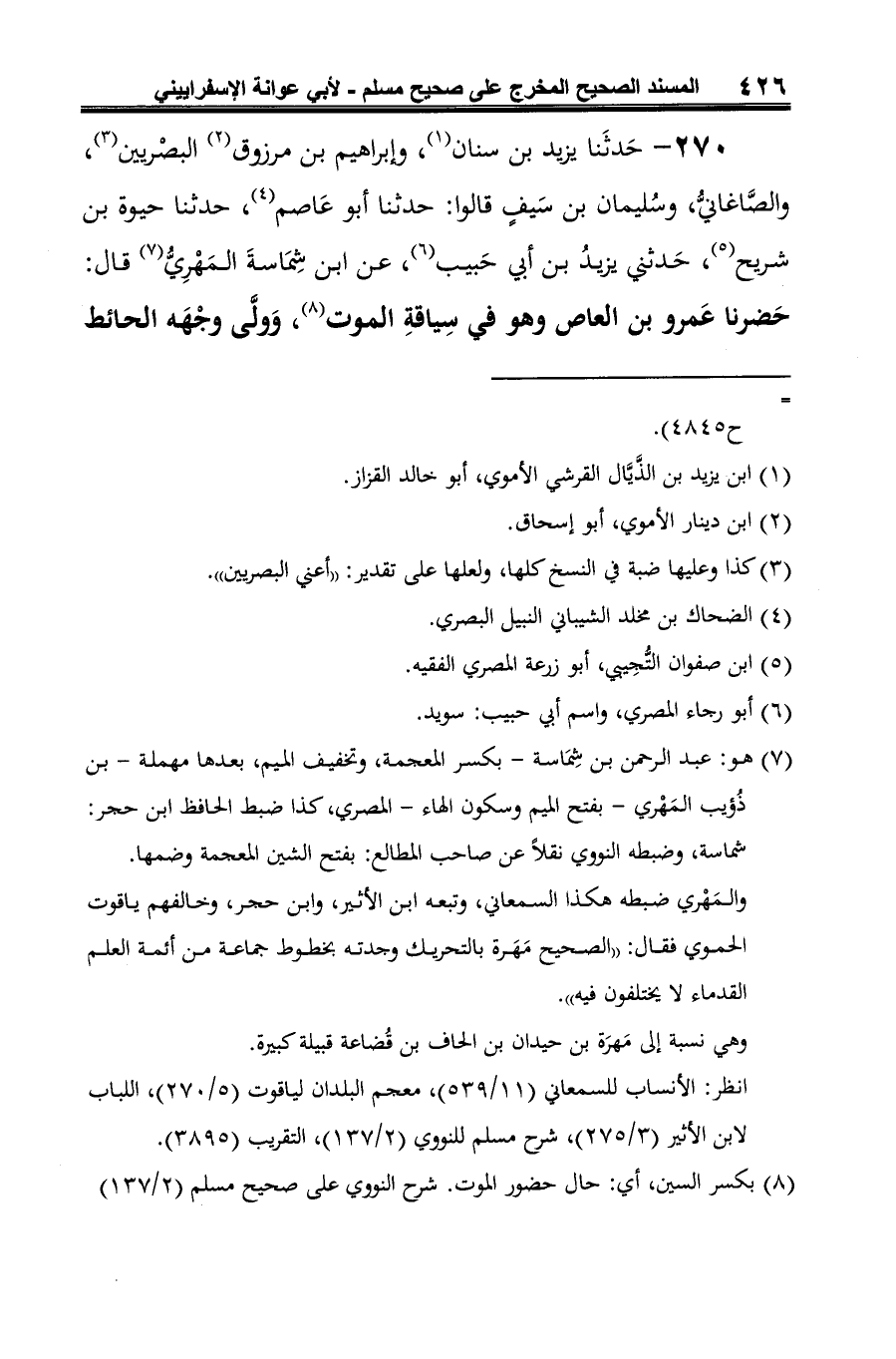 270 - حَدثَنا يزيد بن سنان (¬1)، وإبراهيم بن مرزوق (¬2) البصْريين (¬3)، والصَّاغانيُّ، وسُليمان بن سَيفٍ قالوا: حدثنا أبو عَاصم (¬4)، حدثنا حيوة بن شريح (¬5)، حَدثني يزيدُ بن أبي حَبيب (¬6)، عن ابن شِمَاسةَ المَهْرِيُّ (¬7) قال: حَضرنا عَمرو بن العاص وهو في سياقةِ الموت (¬8)، وَولَّى وجْهَه الحائط