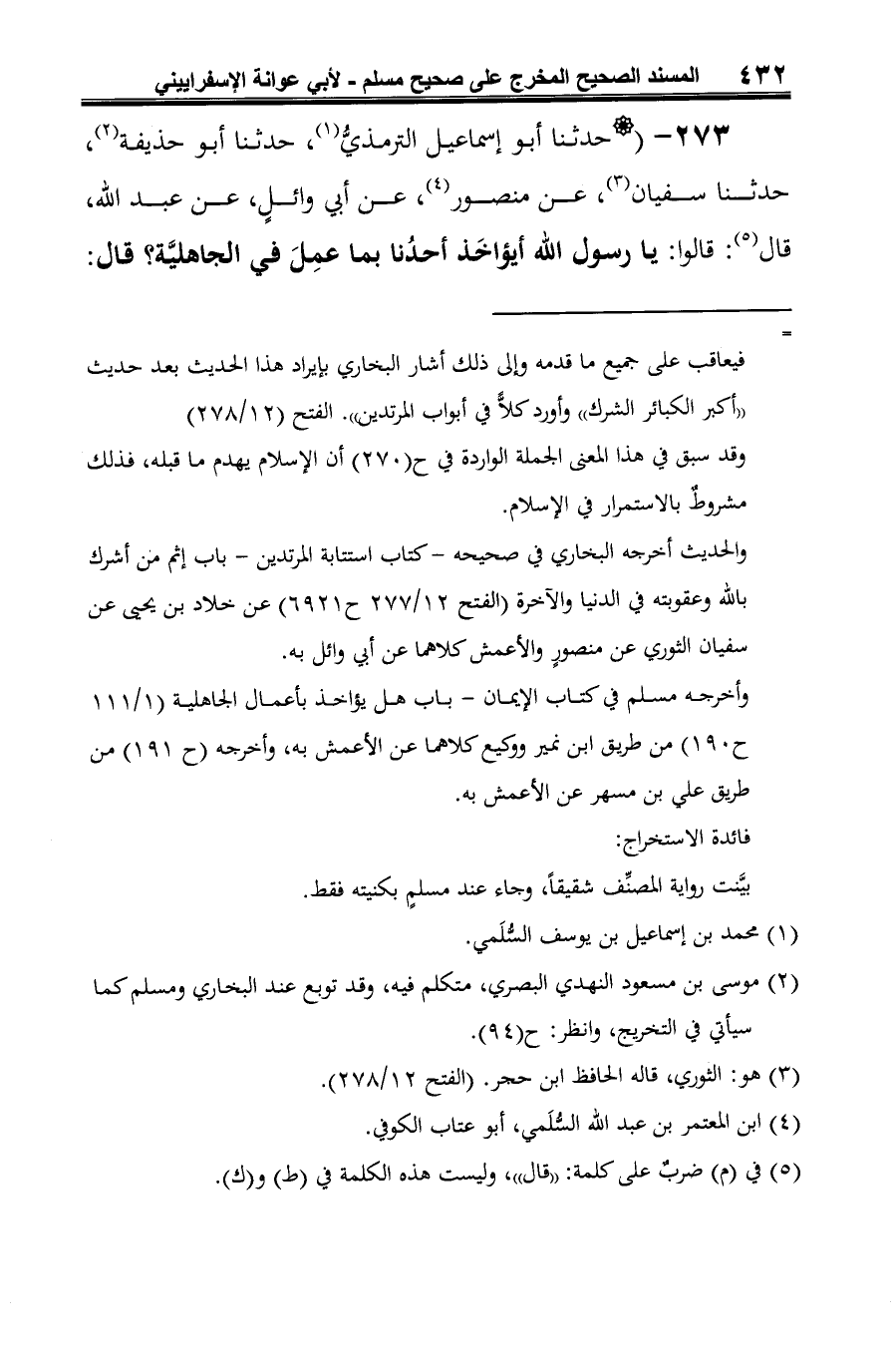 273 - (حدثنا أبو إسماعيل الترمذيُّ (¬1)، حدثنا أبو حذيفة (¬2)، حدثنا سفيان (¬3)، عن منصور (¬4)، عن أبي وائلٍ، عن عبد الله، قال (¬5): قالوا: يا رسول الله أيؤاخَذ أحدُنا بما عمِلَ في الجاهليَّة؟ قال:
