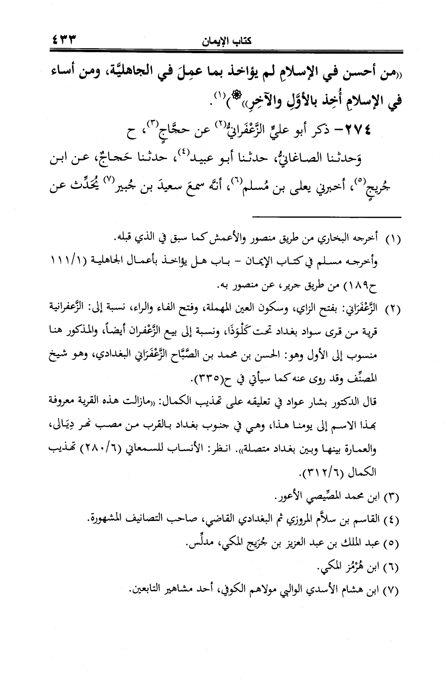 274 - ذكر أبو عليٍّ الزَّعْفَراني (¬1) عن حجَّاجٍ (¬2)، ح