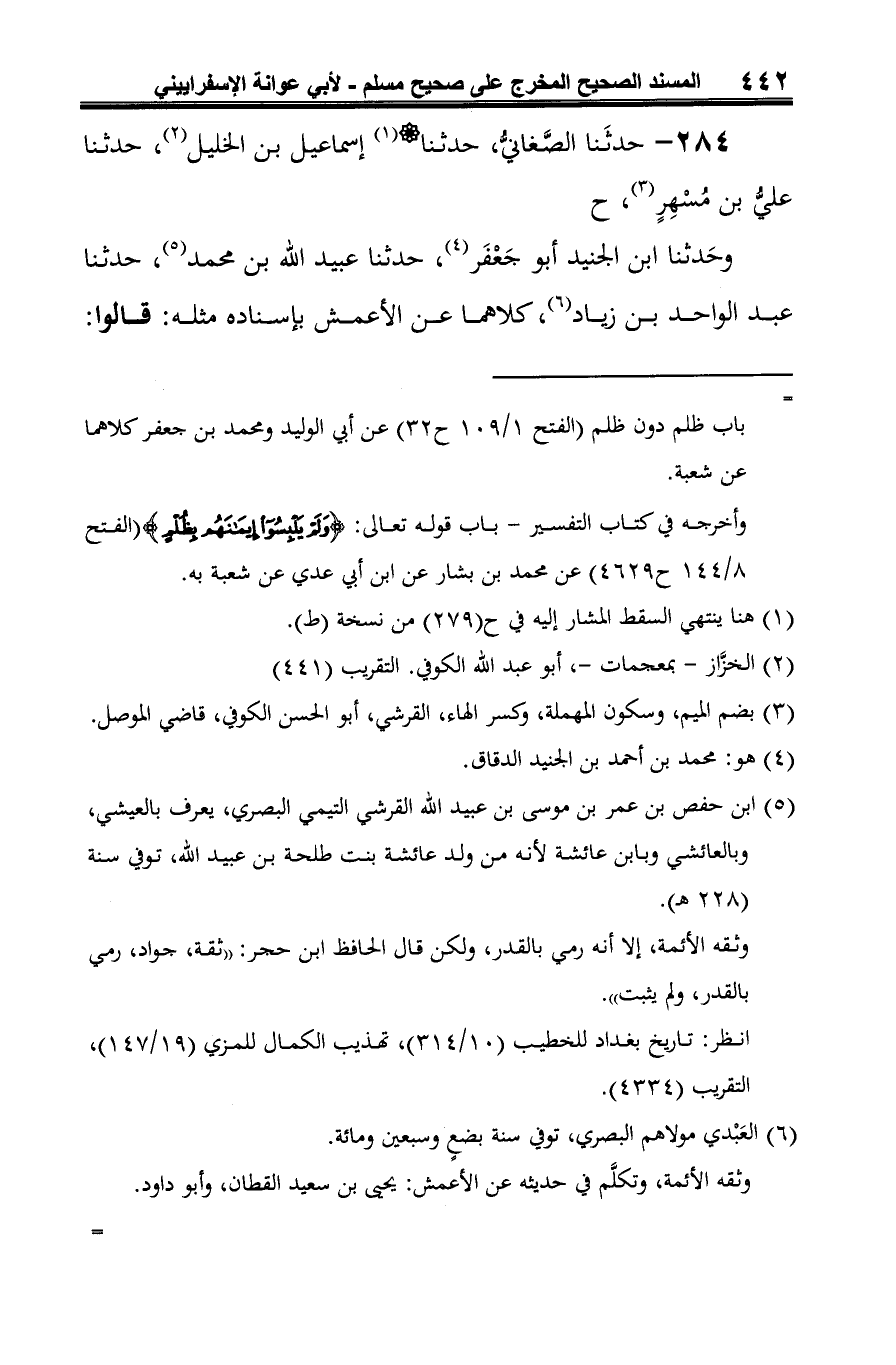 284 - حدثَنا الصَّغانيُّ، حدثنا (¬1) إسماعيل بن الخليل (¬2)، حدثنا عليُّ بن مُسْهِرٍ (¬3)، ح