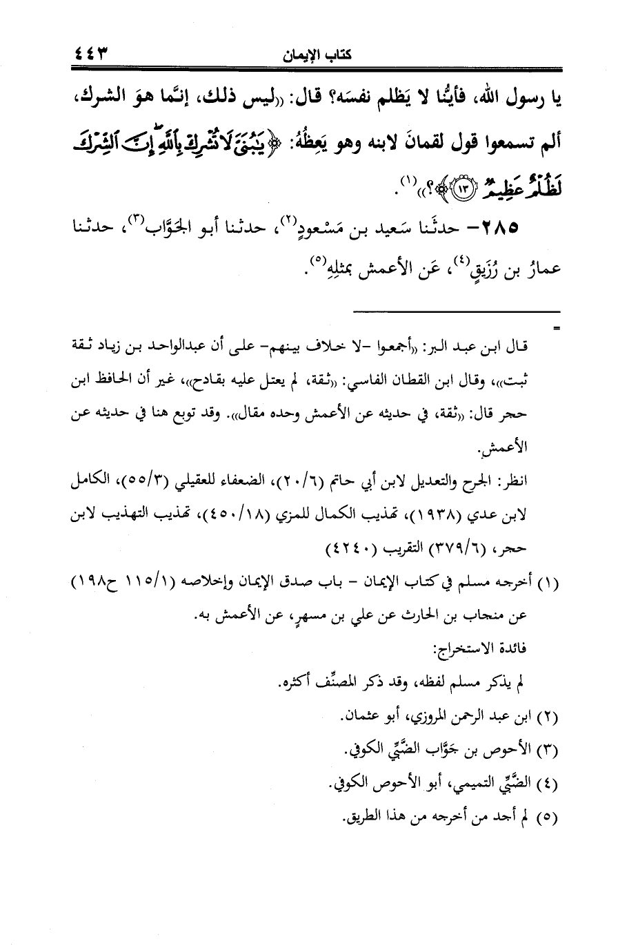 285 - حدثَنا سَعيد بن مَسْعودٍ (¬1)، حدثنا أبو الجَوَّاب (¬2)، حدثنا عمارُ بن رُزَيقٍ (¬3)، عَن الأعمش بمثلِهِ (¬4).