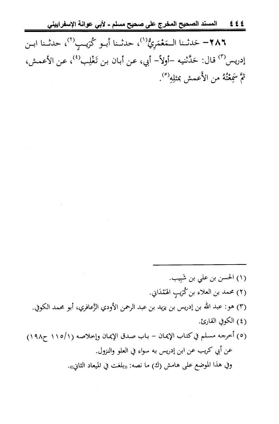 (¬5) أخرجه مسلم في كتاب الإيمان -باب صدق الإيمان وإخلاصه (1/ 115 ح 198) عن أبي كريب عن ابن إدريس به سواء في العلو والنزول.