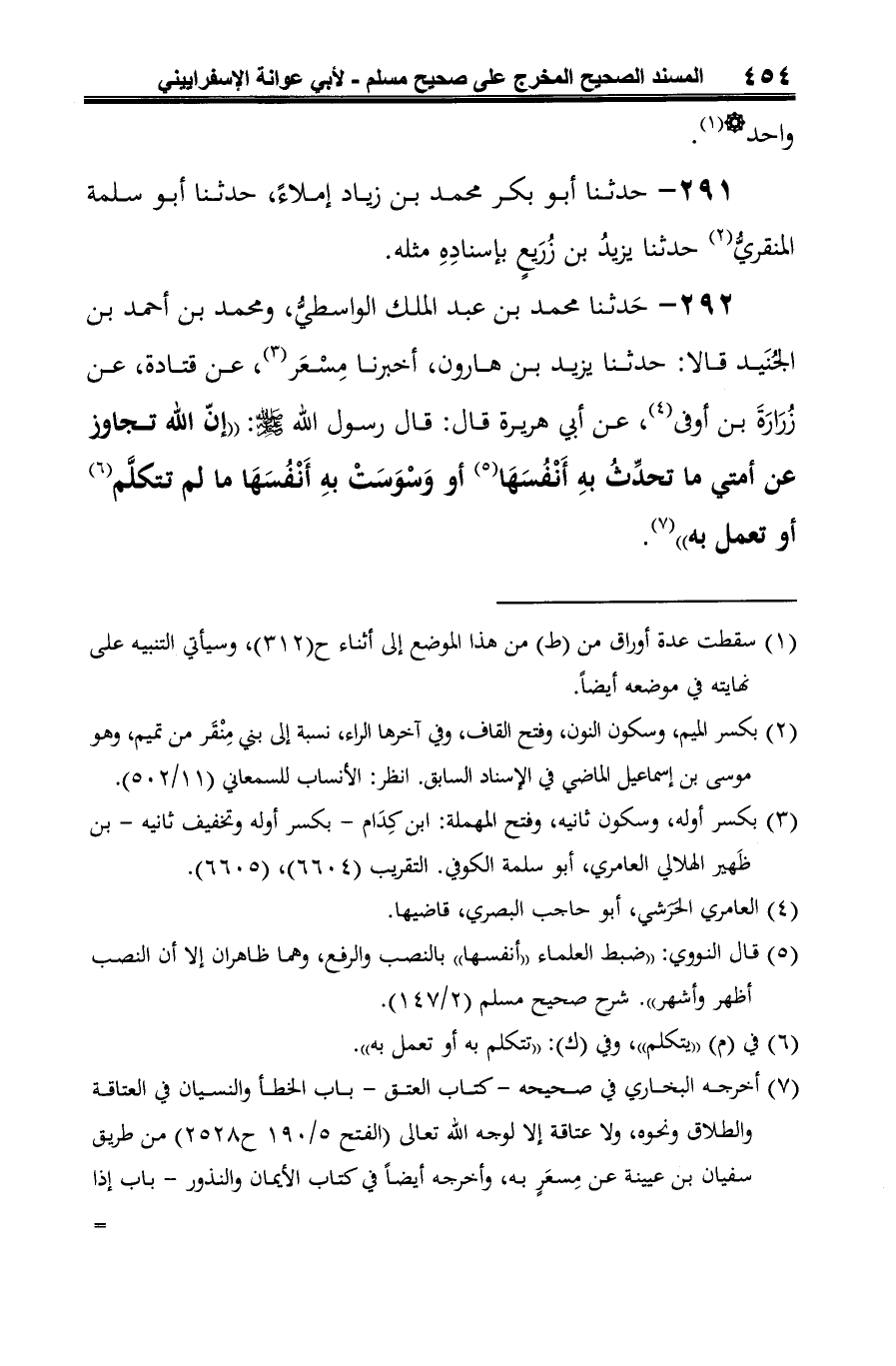 292 - حَدثنا محمد بن عبد الملك الواسطيُّ، ومحمد بن أحمد بن الجُنَيد قالا: حدثنا يزيد بن هارون، أخبرنا مِسْعَر (¬1)، عن قتادة، عن زُرَارَةَ بن أوفى (¬2)، عن أبي هريرة قال: قال رسول الله -صلى الله عليه وسلم-: "إنّ الله تجاوز عن أمتي ما تحدِّثُ بهِ أَنْفُسَهَا (¬3) أو وَسْوَسَتْ بهِ أَنْفُسَهَا ما لم تتكلَّم (¬4) أو تعمل به" (¬5).