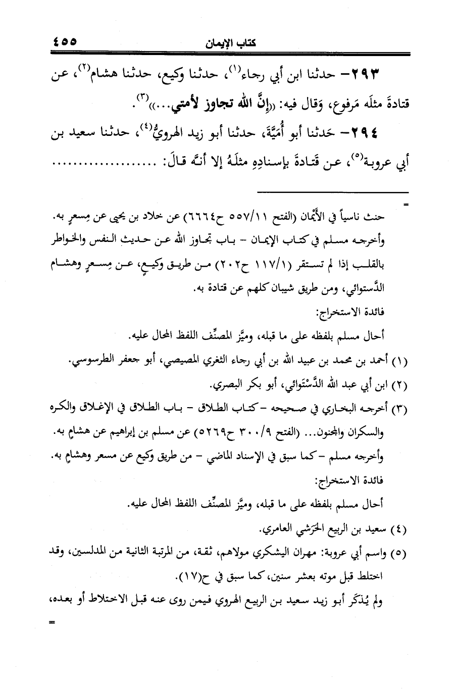 والحديث أخرجه مسلم في كتاب الإيمان -باب تجاوز الله عن حديث النفس والخواطر بالقلب إذا لم تستقر (1/ 116 - 117 ح 202) من طريق ابن علية، وابن أبي عدي، وعلي بن مسهر وعبدة بن سليمان كلهم عن سعيد بن أبي عروبة به.