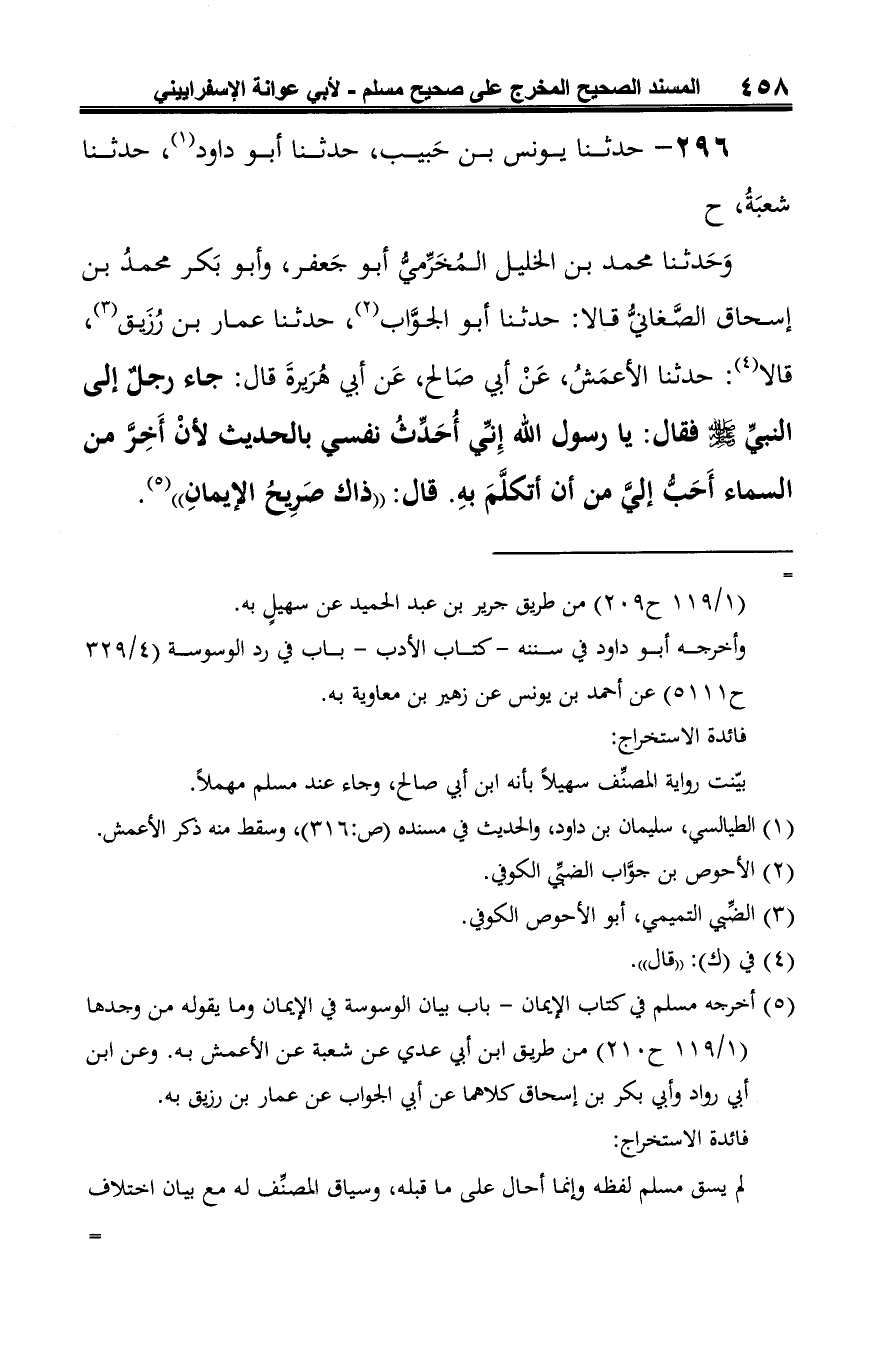 (¬5) أخرجه مسلم في كتاب الإيمان -باب بيان الوسوسة في الإيمان وما يقوله من وجدها (1/ 119 ح 210) من طريق ابن أبي عدي عن شعبة عن الأعمش به. وعن ابن أبي رواد وأبي بكر بن إسحاق كلاهما عن أبي الجواب عن عمار بن رزيق به.