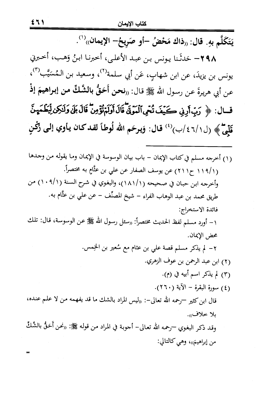 298 - حَدثَنا يونس بن عبد الأعلى، أخبرنا ابنُ وَهب، أخبرني يونس بن يزيدَ، عن ابن شهابٍ، عَن أبي سلمة (¬1)، وسعيد بن المُسَيَّب (¬2)، عن أبي هريرةَ عن رسول الله -صلى الله عليه وسلم- قال: "نحن أَحَقُّ بالشَّكِّ من إبراهيمَ إذْ قال: {رَبِّ أَرِنِي كَيْفَ تُحْيِ الْمَوْتَى قَالَ أَوَلَمْ تُؤْمِنْ قَالَ بَلَى وَلَكِنْ لِيَطْمَئِنَّ قَلْبِي} (¬3) قال: وَيرحَم الله لُوطًا لقد كان يأوي إلى رُكْنٍ