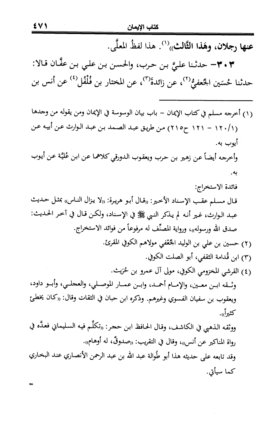 303 - حدثنا عليَّ بن حرب، والحسن بن علي بن عفَّان قالا: حدثنا حُسَين الجُعفيُّ (¬1)، عن زائدةَ (¬2)، عن المختار بن فُلْفُل (¬3) عن أنس بن