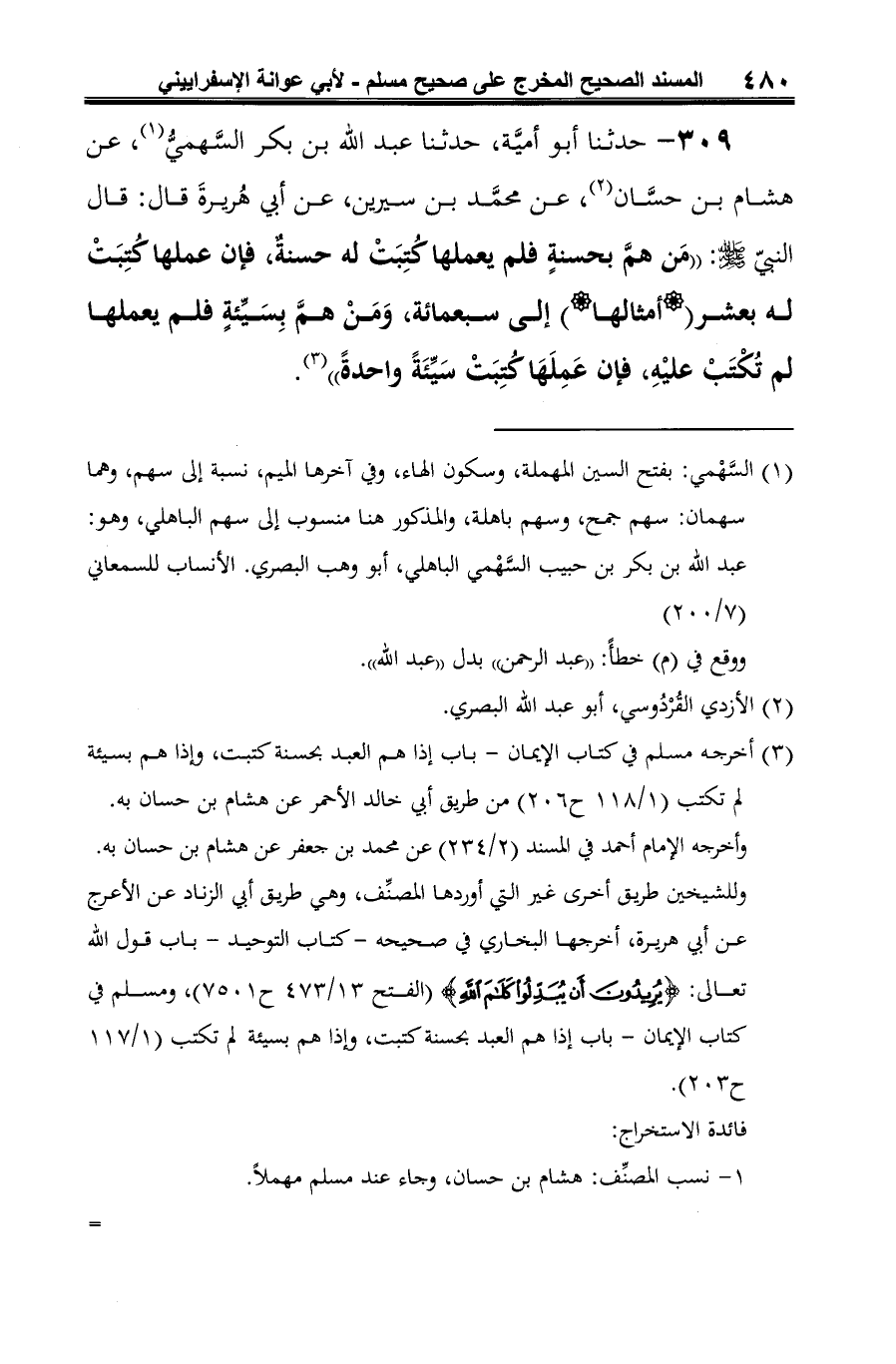 309 - حدثَنا أبو أميَّة، حدثنا عبد الله بن بكر السَّهميُّ (¬1)، عن هشام بن حسَّان (¬2)، عن محمَّد بن سيرين، عن أبي هُريرةَ قال: قال النبي -صلى الله عليه وسلم-: "مَن همَّ بحسنةٍ فلم يعملها كُتِبَتْ له حسنةٌ، فإن عملها كُتِبَتْ له بعشر (*أمثالها*) إلى سبعمائة، وَمَنْ همَّ بِسَيِّئةٍ فلم يعملها لم تُكْتَبْ عليْهِ، فإن عَمِلَهَا كُتِبَتْ سَيِّئَةً واحدةً" (¬3).
