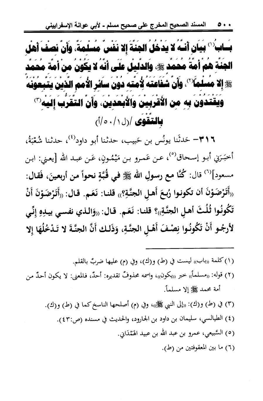 316 - حَدثَنا يونُس بن حَبيب، حدثنا أبو داود (¬1)، حدثنا شُعْبَةُ، أخبَرَنِي أبو إسحاق (¬2)، عن عَمرو بن مَيْمُونٍ، عَن عبد الله [يعني: ابن مسعود] (¬3) قال: كُنَّا مع رسولِ الله -صلى الله عليه وسلم- في قُبَّةٍ نحوًا من أربعينَ، فَقال: "أَتَرْضَوْنَ أن تكونوا رُبعَ أَهلِ الجنَّةِ؟ " قلنا: نَعَم. قال: "أَتَرْضَوْنَ أَنْ تَكُونُوا ثُلُثَ أهلِ الجنَّةِ"؟ قلنا: نَعَم. قال: "وَالذي نفسي بيدِهِ إِنِّي لأرجُو أَنْ تَكُونُوا نِصْفَ أَهْلِ الجنَّةِ، وَذَلك أَنَّ الجنَّةَ لا تَدْخُلُهَا إِلا