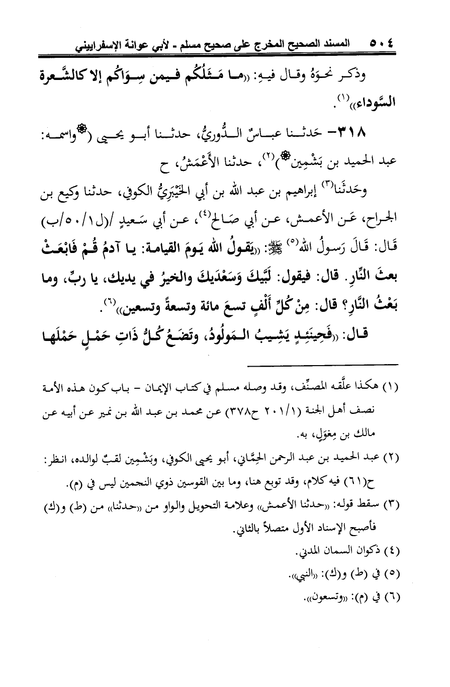 وحَدثَنا (¬2) إبراهيم بن عبد الله بن أبي الخيبَرِيُّ الكوفي، حدثنا وكيع بن الجراح، عَن الأعمش، عن أبي صَالح (¬3)، عن أبي سَعيدٍ قَال: قَالَ رَسولُ الله (¬4) -صلى الله عليه وسلم-: "يَقولُ الله يَومَ القيامة: يا آدمُ قُمْ فَابْعَثْ بعثَ النِّارِ. قال: فيقول: لَبَّيْكَ وَسَعْدَيكَ والخيرُ في يديك، يا ربِّ، وما بَعْثُ النَّارِ؟ قال: مِنْ كُلِّ أَلْفٍ تسعَ مائة وتسعةً وتسعين" (¬5).