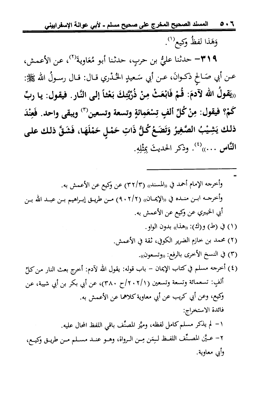 319 - حدثنا علي بن حربٍ، حدثنا أبو مُعَاويةَ (¬1)، عن الأعمش، عن أبي صَالحٍ ذكوانَ، عن أبي سَعيدٍ الخُدْري قال: قال رسولُ الله صلى الله عليه وسلم: "يَقولُ الله لآدمَ: قُمْ فَابْعَثْ مِنْ ذُرِّيَّتِكَ بَعْثًا إلى النَّار. فيقول: يا ربِّ كَمْ؟ فيقول: مِنْ كُلِّ ألفٍ تِسْعَمِائةٍ وتسعة وتسعين (¬2) ويبقى واحد. فَعِنْدَ ذلك يَشِيْبُ الصَّغِيرُ وَتَضَعُ كُلُّ ذَاتِ حَمْلٍ حَمْلَهَا، فَشَقَّ ذلك على النَّاس ... " (¬3). وذكر الحديثَ بِمِثْلِهِ.