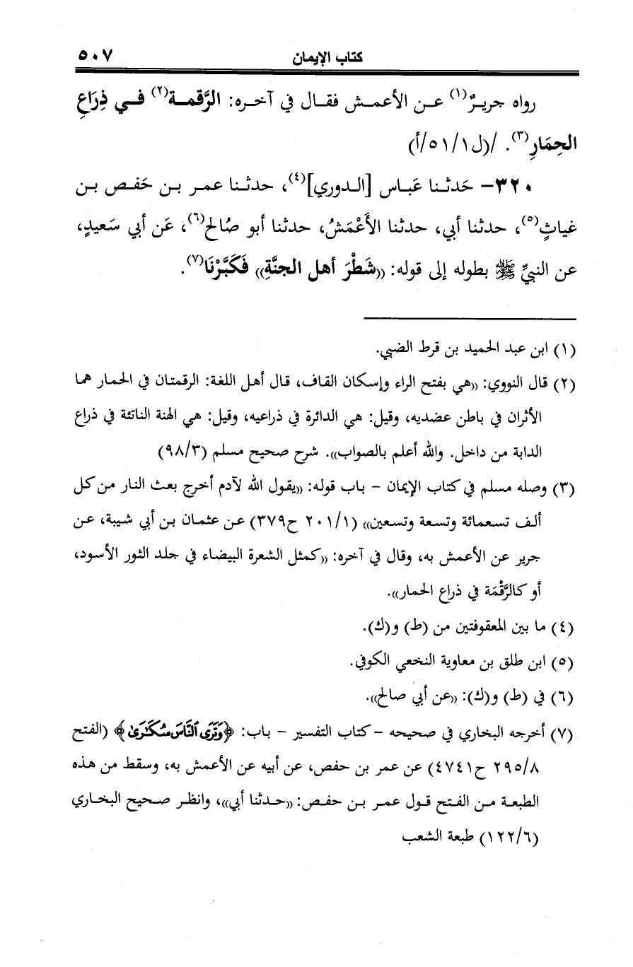 320 - حَدثنا عَباس [الدوري] (¬1)، حدثنا عمر بن حَفص بن غياثٍ (¬2)، حدثنا أبي، حدثنا الأَعْمَشُ، حدثنا أبو صالح (¬3)، عَن أبي سَعيدٍ، عن النبيّ -صلى الله عليه وسلم- بطوله إلى قوله: "شَطْرَ أهل الجنَّةِ" فَكَبَّرْنَا (¬4).