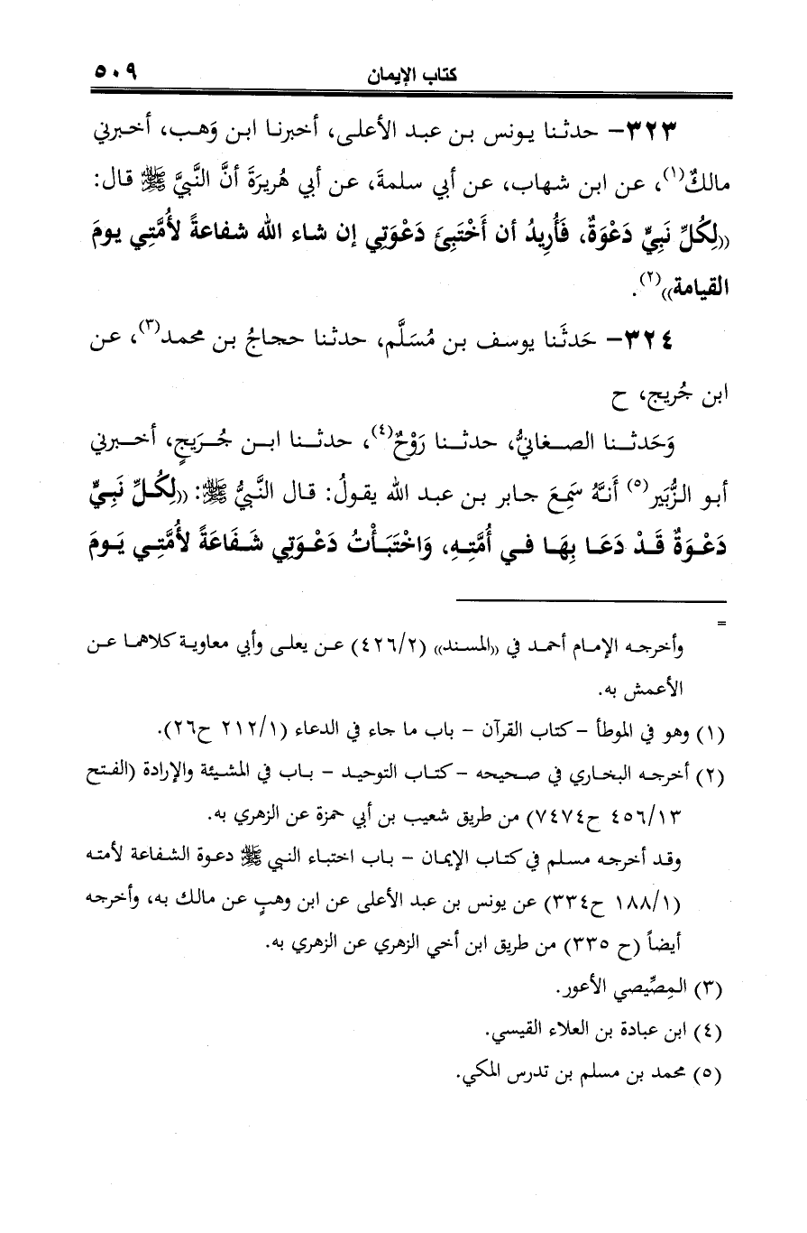 323 - حدثنا يونس بن عبد الأعلى، أخبرنا ابن وَهب، أخبرني مالكٌ (¬1)، عن ابن شهاب، عن أبي سلمةَ، عن أبي هُريرَةَ أنَّ النَّبيَّ صلى الله عليه وسلم قال: "لِكُلِّ نَبِيٍّ دَعْوَةٌ، فَأُرِيدُ أن أَخْتَبِئَ دَعْوَتِي إن شاء الله شفاعةً لأُمَّتِي يومَ القيامة" (¬2).