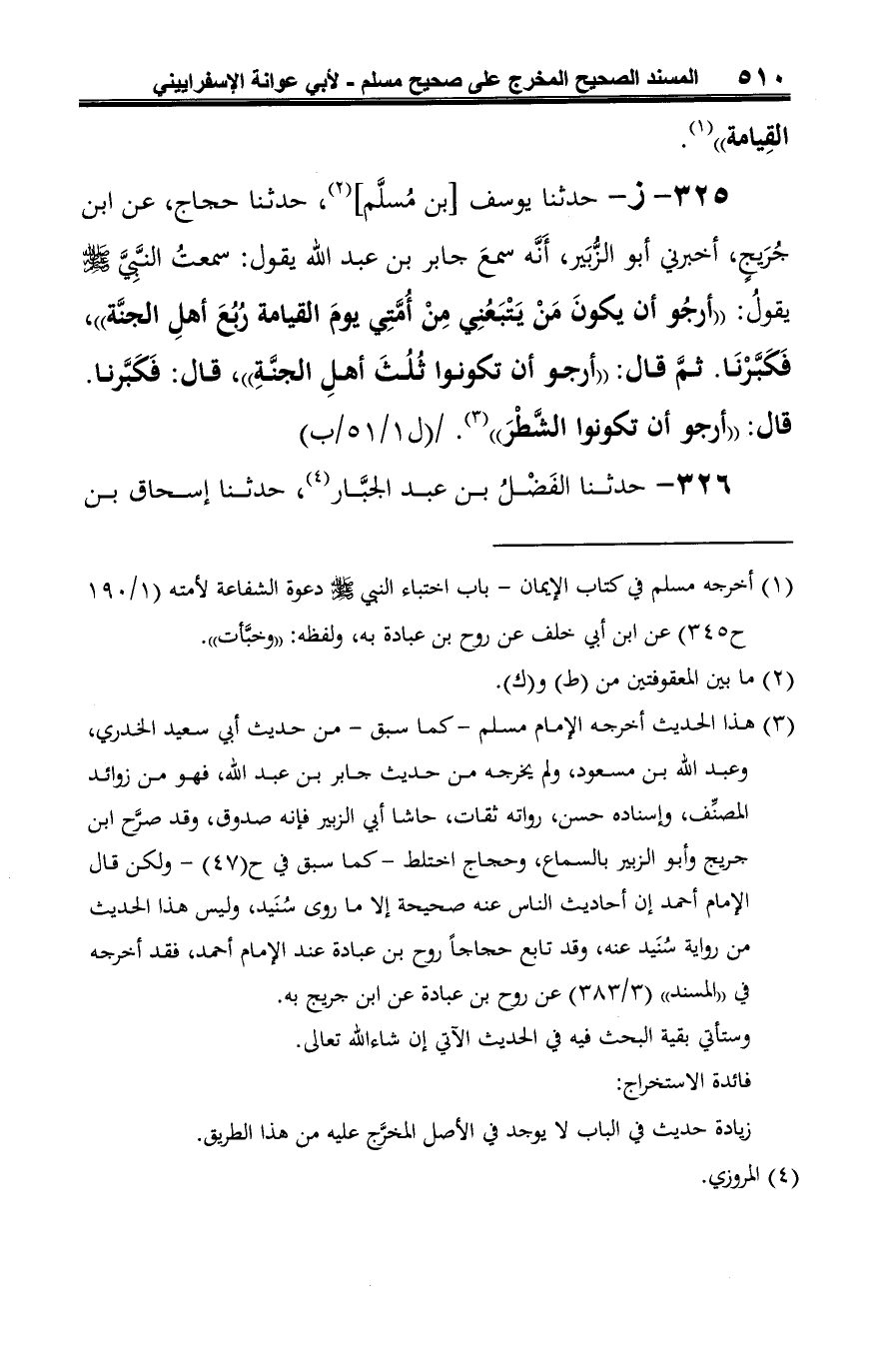 325 - ز - حدثنا يوسف [بن مُسلَّم] (¬1)، حدثنا حجاج، عن ابن جُرَيجٍ، أخبرني أبو الزُّبَير، أَنَّه سمعَ جابر بن عبد الله يقول: سمعتُ النَّبي -صلى الله عليه وسلم- يقولُ: "أرجُو أن يكونَ مَنْ يَتْبَعُنِي مِنْ أُمَّتِي يومَ القيامة رُبُعَ أهلِ الجنَّة"، فَكَبَّرْنَا. ثُمَّ قال: "أرجو أن تكونوا ثُلُثَ أهلِ الجنَّةِ"، قال: فَكَبَّرنا. قال: "أرجو أن تكونوا الشَّطْرَ" (¬2).