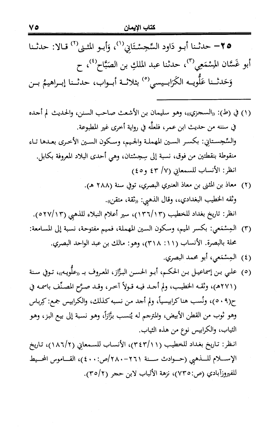 25 - حدثنا أبو دَاود السِّجِسْتَانِي (¬1)، وَأبو المثنى (¬2) قالا: حدثنا أبو غَسَّان المِسْمَعِي (¬3)، حدثنا عبد الملكِ بن الصَبَّاح (¬4)، ح