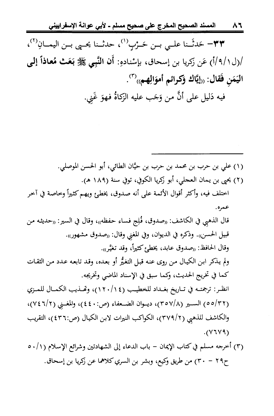 33 - حَدثَنا علي بن حَرْبٍ (¬1)، حدثنا يحيى بن اليمانِ (¬2)، عَن زكريا بن إسحاق، بإسْنادهِ: أَن النَّبِي -صلى الله عليه وسلم- بَعَث مُعاذًا إلى اليَمَنِ فَقال: "إيَّاك وَكرائم أموَالِهم" (¬3).