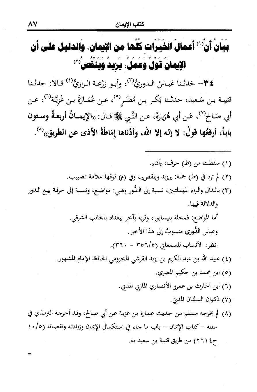 34 - حَدثنا عَباسُ الدوريُّ (¬1)، وأبو زرْعة الرازيُّ (¬2) قالا: حدثنا قتيبة بن سَعيد، حدثنا بَكر بن مُضَرٍ (¬3)، عن عُمَارَةَ بن غَزِيَّة (¬4)، عن أبي صَالح (¬5)، عَن أبي هُرَيرَةَ، عن النَّبِي -صلى الله عليه وسلم- قال: "الإيمانُ أربعةٌ وستون بابًا، أرفعُها قولُ: لا إله إلا الله، وأدْناها إِمَاطَةُ الأذى عن الطريق" (¬6).