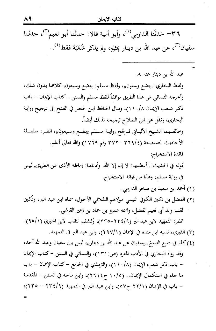 36 - حَدثَنا الدارمي (¬1)، وأبو أمية قالا: حدثنا أبو نعيم (¬2)، حدثنا سفيان (¬3)، عن عبد الله بن دينار بِمثلِهِ، ولم يذكر شُعَبَهُ فقط (¬4).