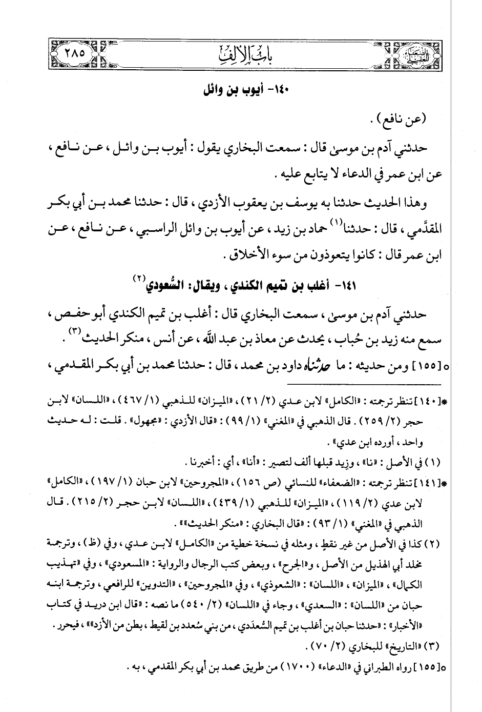 (3) * [141] تنظر ترجمته: «الضعفاء» للنسائي (ص 156) , «المجروحين» لابن حبان (1/ 197) , «الكامل» لابن عدي (2/ 119) , «الميزان» للذهبي (1/ 439) , «اللسان» لابن حجر (2/ 215). قال الذهبي في «المغني» (1/ 93): «قال البخاري: «منكر الحديث»».