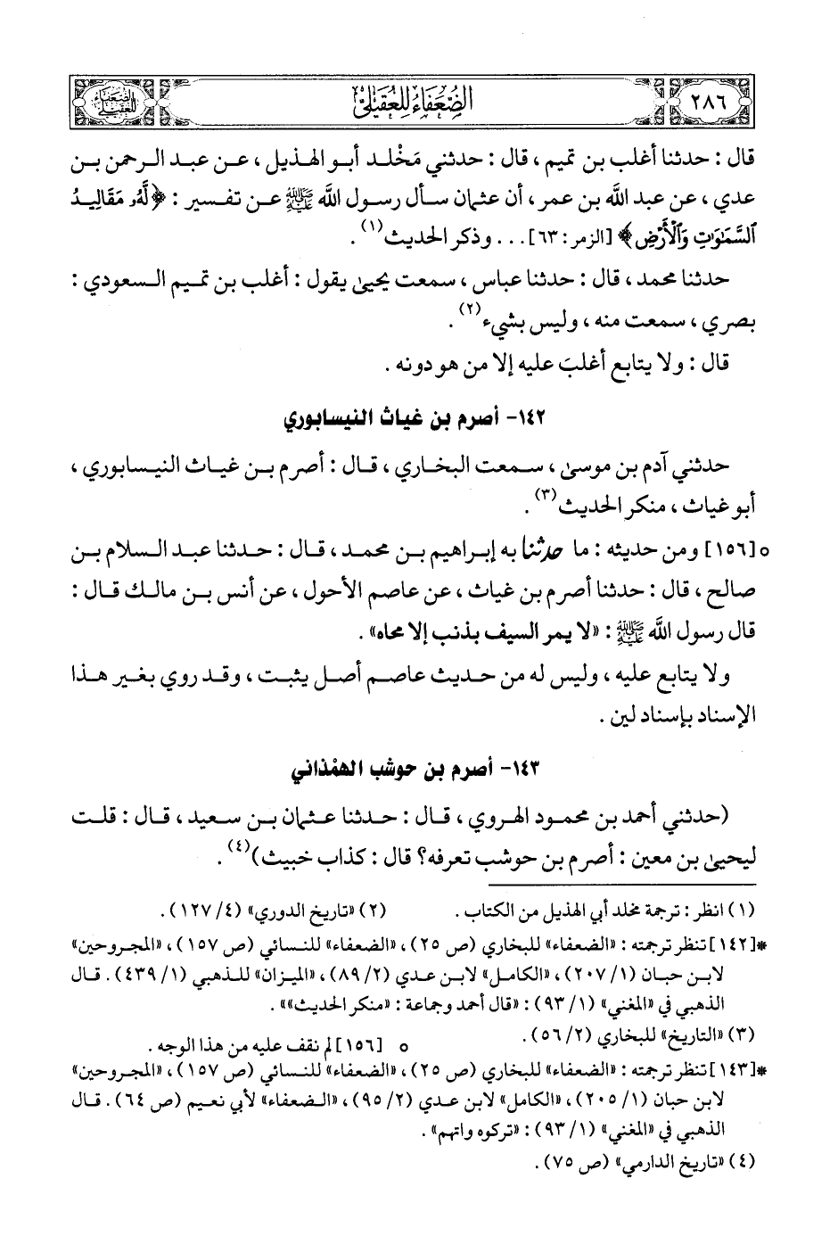 (6) * [143] تنظر ترجمته: «الضعفاء» للبخاري (ص 25) , «الضعفاء» للنسائي (ص 157) , «المجروحين» لابن حبان (1/ 205) , «الكامل» لابن عدي (2/ 95) , «الضعفاء» لأبي نعيم (ص 64). قال الذهبي في «المغني» (1/ 93): «تركوه واتهم».