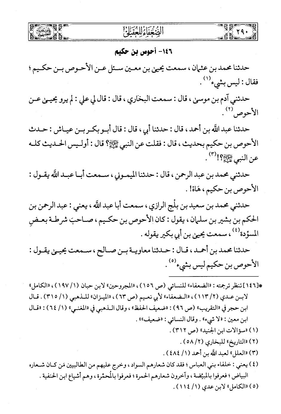 (1) * [146] تنظر ترجمته: «الضعفاء» للنسائي (ص 156) , «المجروحين» لابن حبان (1/ 197) , «الكامل» لابن عدي (2/ 113) , «الضعفاء» لأبي نعيم (ص 63) , «الميزان» للذهبي (1/ 315). قال ابن حجر في «التقريب» (ص 96): «ضعيف الحفظ» , وقال الذهبي في «المغني» (1/ 64): «قال ابن معين: «لا شيء». وقال النسائي: «ضعيف»».