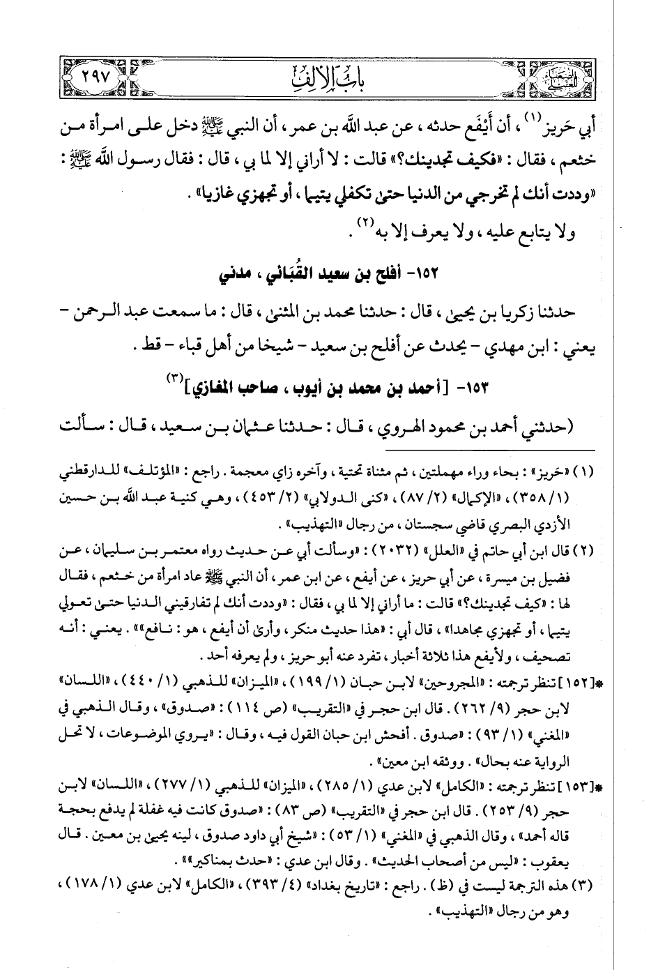 (1) «حَريز»: بحاء وراء مهملتين، ثم مثناة تحتية، وآخره زاي معجمة. راجع: «المؤتلف» للدارقطني (1/ 358)، «الإكمال» (2/ 87)، «كنى الدولابي» (2/ 453)، وهي كنية عبد الله بن حسين الأزدي البصري قاضي سجستان، من رجال «التهذيب».