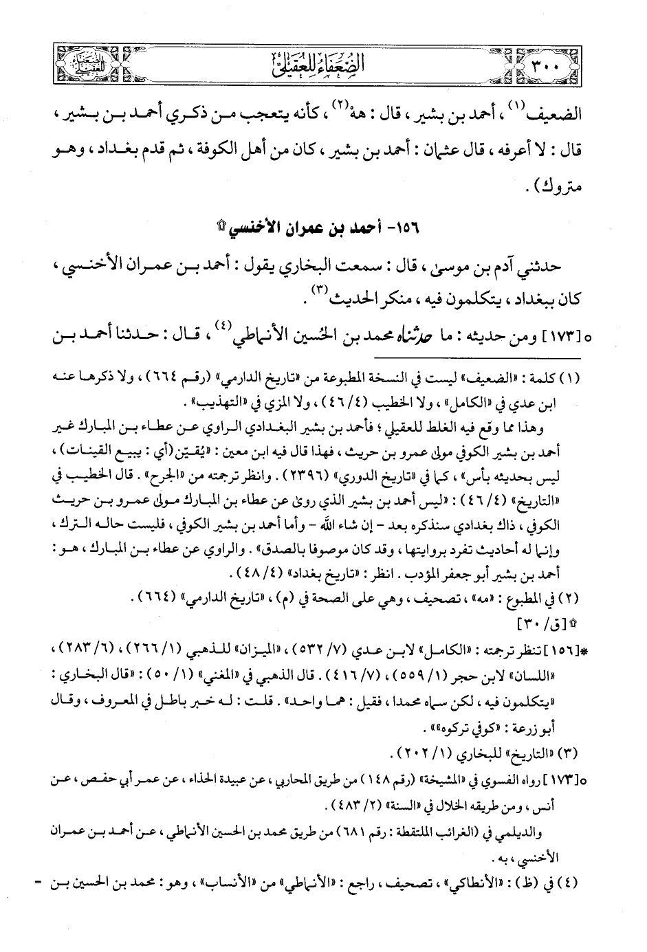 (7) في (ظ): «الأنطاكي»، تصحيف، راجع: «الأنماطي» من «الأنساب»، وهو: محمد بن الحسين بن عبد الرحمن الواسطي أبو العباس الأنماطي، ترجم له في «تاريخ بغداد» (2/ 227)، وقد تكررت رواية العقيلي عنه، وصححه المحقق من (م).